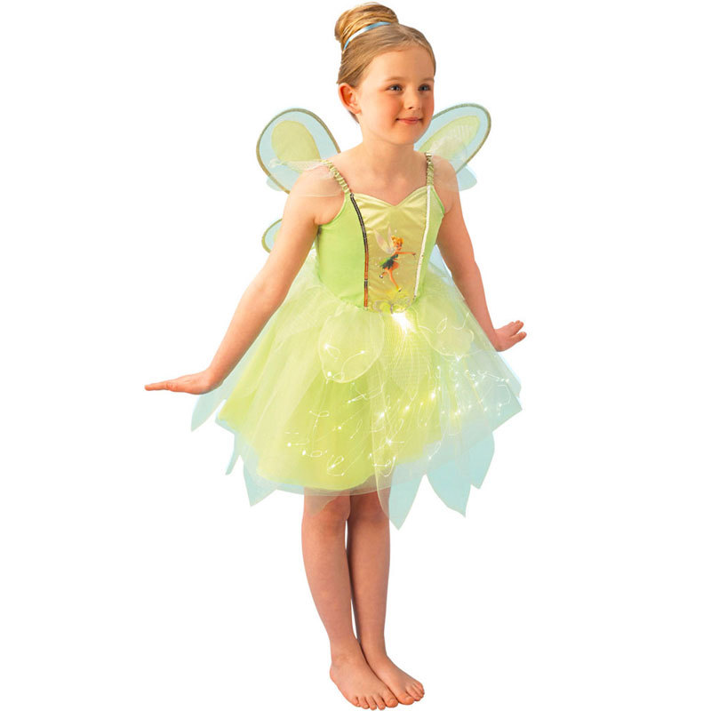 Blinkande Tingeling Maskeraddräkt Barn inkluderar en detaljerad grön glittrig klänning med silverpaljetter samt en bild på Tingeling tryckt framtill. Det ingår dessutom ett par matchande vingar som enkelt fästs bakpå klänningen.