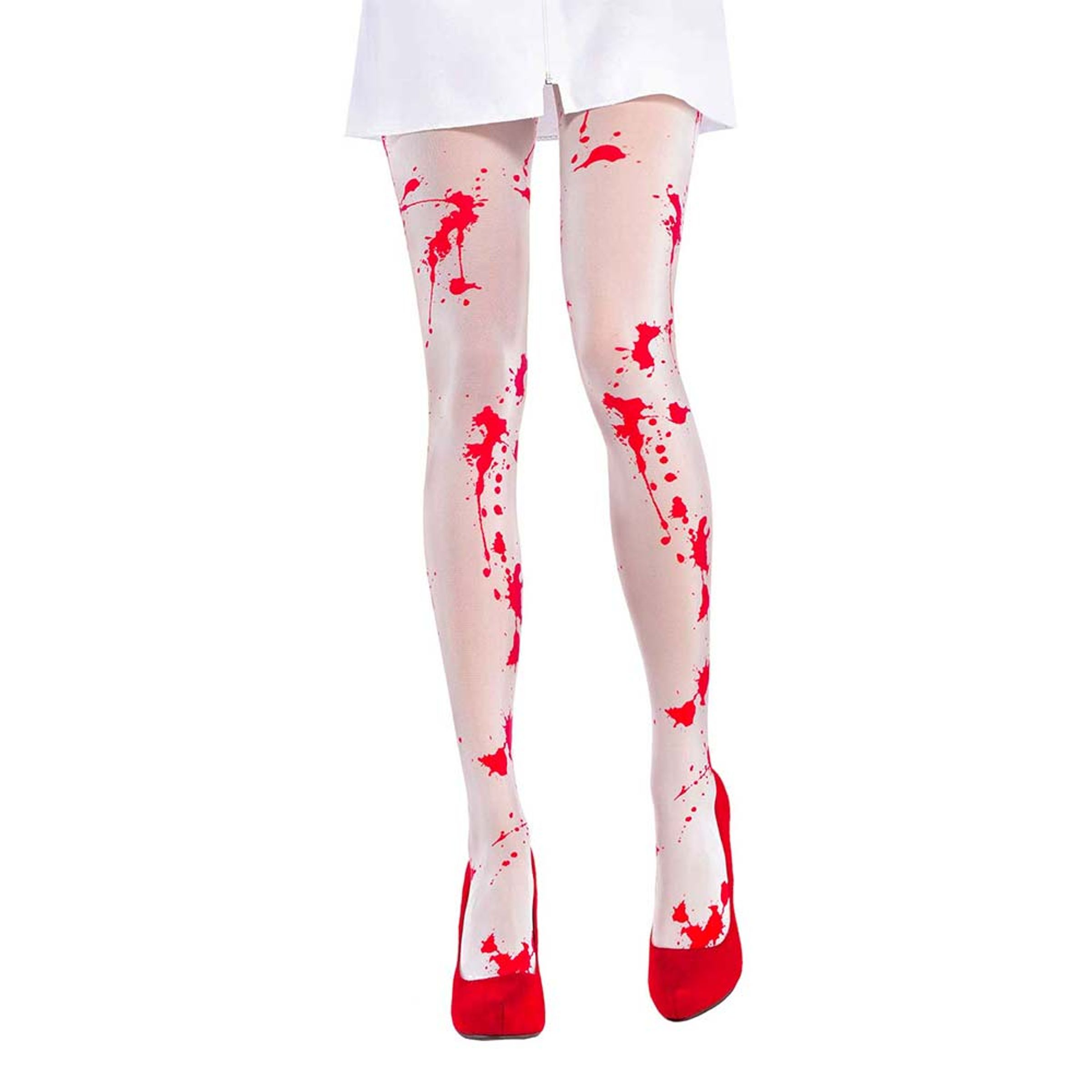 Ska du klä ut dig till en zombie sjuksköterska på halloween behöver du såklart fixa din outfit från topp till tå för en så maxad läskig look som möjligt. Även dina ben såklart! Så hoppa i dessa blodiga strumpbyxor och gör dig redo för halloweenfesten!