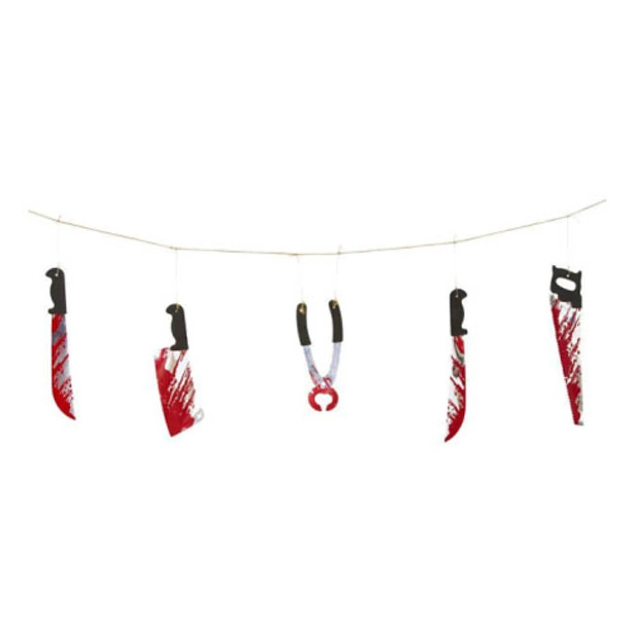 Är det dags för Halloween fest eller vill du bara pynta hemmet inför Halloweeen? Då blir den här blodiga girlangen perfekt. På ett snören hänger blodiga vapen av plast som ser ut att komma direkt från en seriemördares källare.