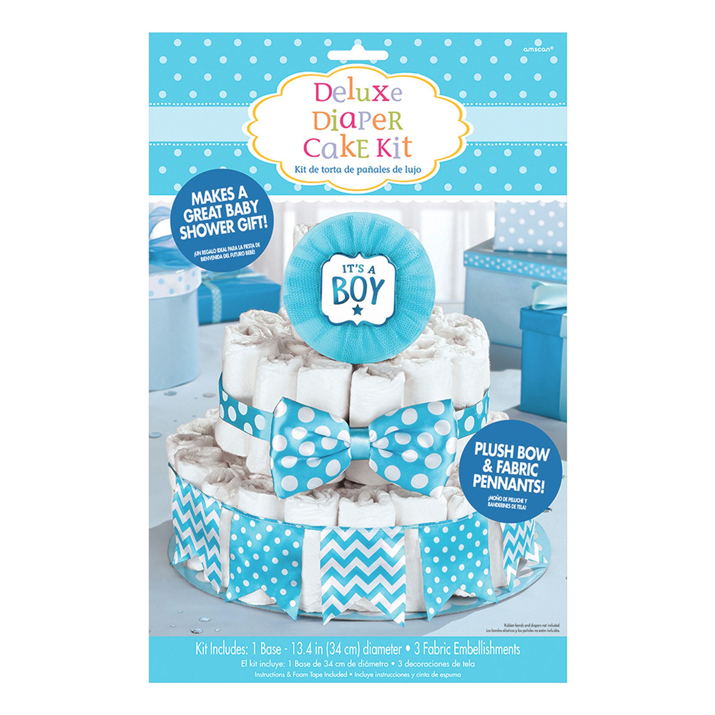 Blöjtårta Dekorationsset Blå inkluderar en bas (34 cm stor) och tre stycken utsmyckningar i blått. Utsmyckningarna består av en flaggdekoration, en dekoration som det står "It´s a Boy" på och en dekoration med en stor rosett. Detta är endast ett kit för att kunna bygga en blöjtårta. Blöjor ingår inte.