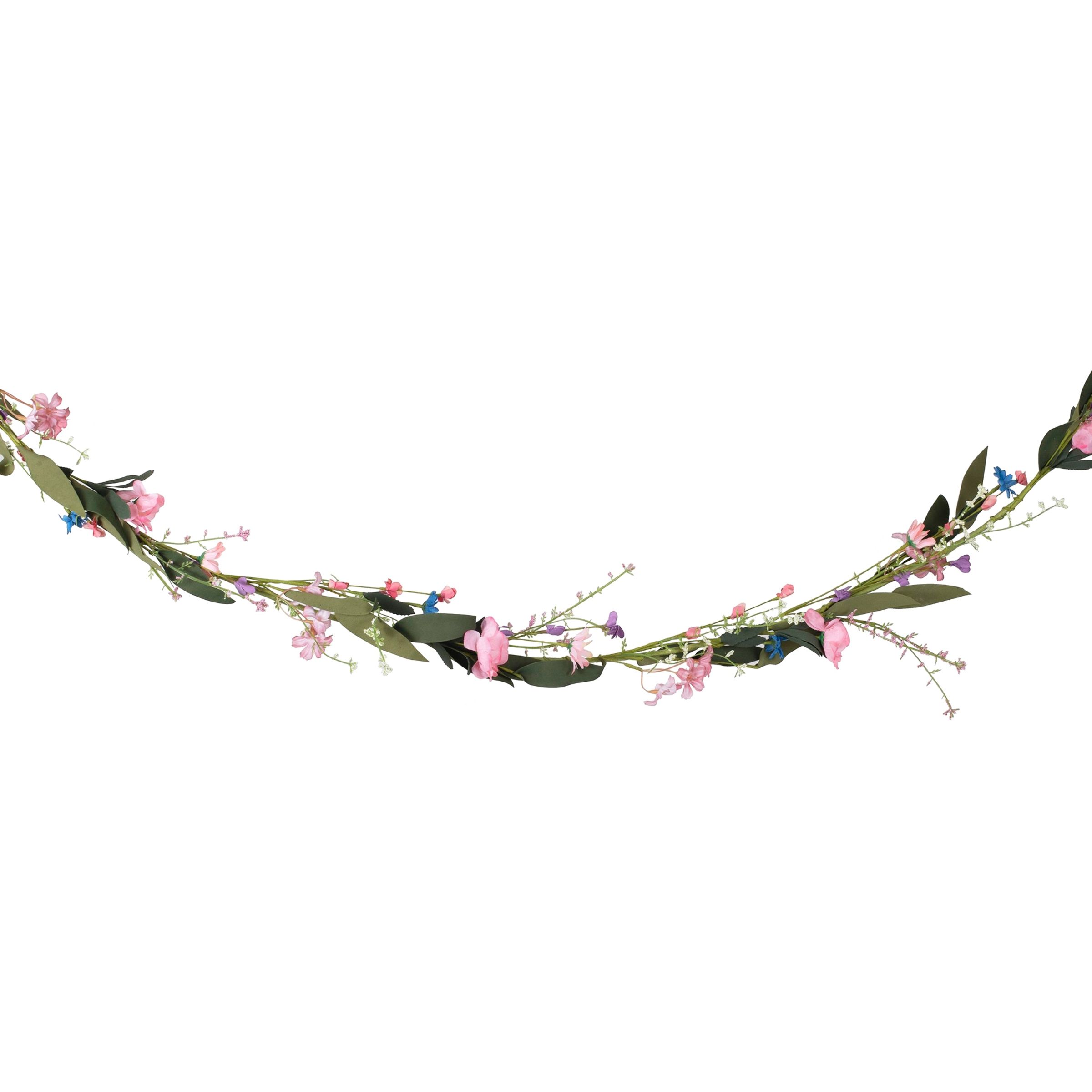 Blomgirlang Rosa Boho är en girlang med gröna blad och blommor i rosa, lila och blått. Girlangen är tillverkad i plast och är 1,9 m lång. Den kan hängas upp på en vägg eller läggas på ett bord som en bordsdekoration. Det är bara girlangen som ingår, inget annat som syns på bilden.