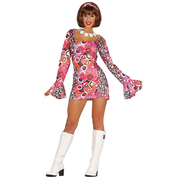 Hippie Maskeraddräkt omfattar en hippiedräkt med en kort klänning med långa utsvängda ärmar och ett matchande hårband. Dräkten är dekorerad med rosa blommor och ett cirkelmönster.