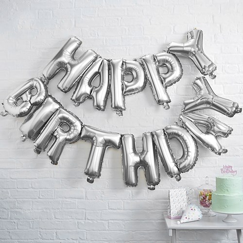 Pynta födelsedagskalaset med silvriga ballonger med texten HAPPY BIRTHDAY! Blås upp ballongerna, trä dem på ett snöre och häng på väggen – redo för kalas!