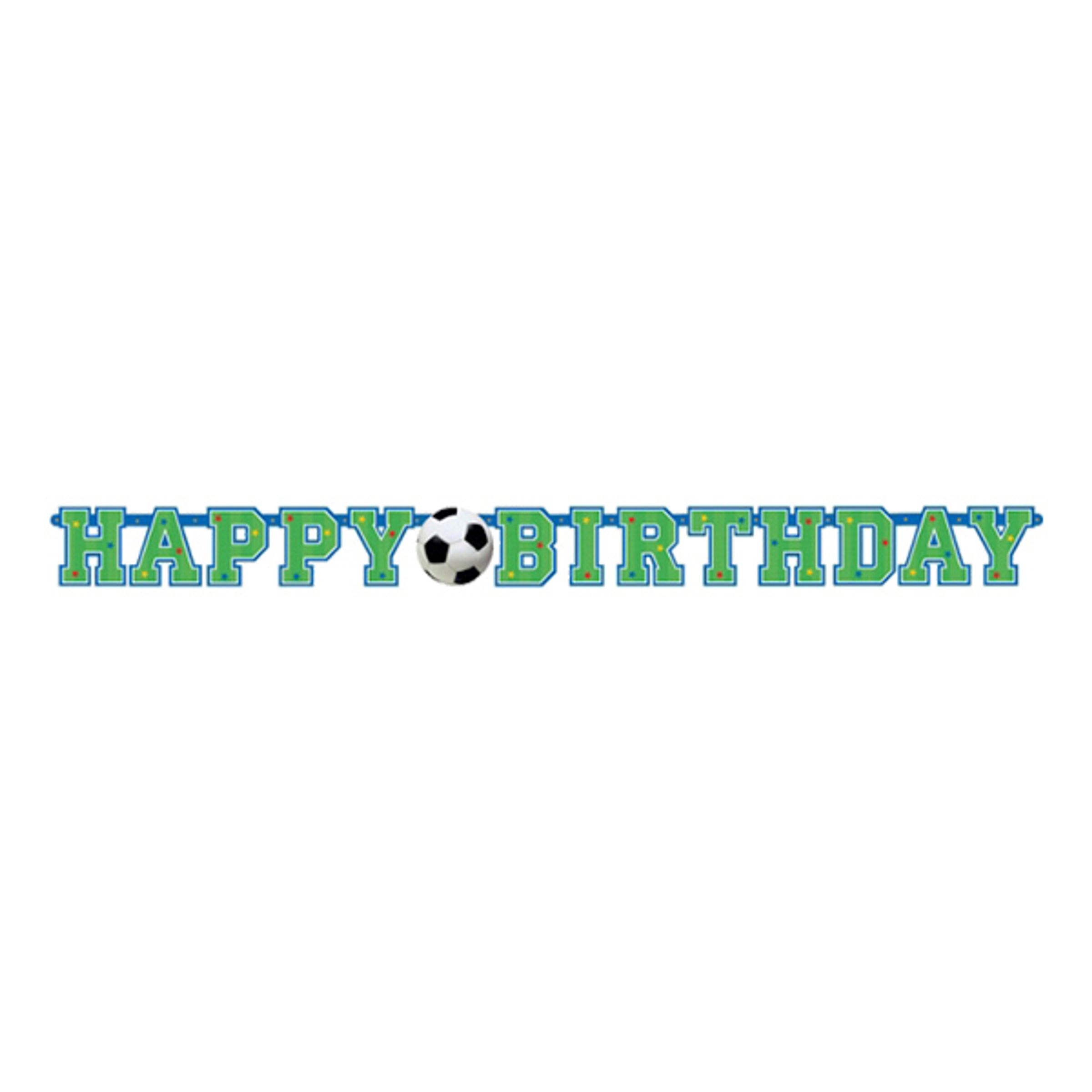 Gröna bokstäver inramade av en blå kontur och med små färgglada prickar bildar de två orden "Happy Birthday" med en fotboll i mitten av denna coola bokstavsgirlang. Något för de verkliga entusiasterna av fotboll inför födelsedagskalaset!