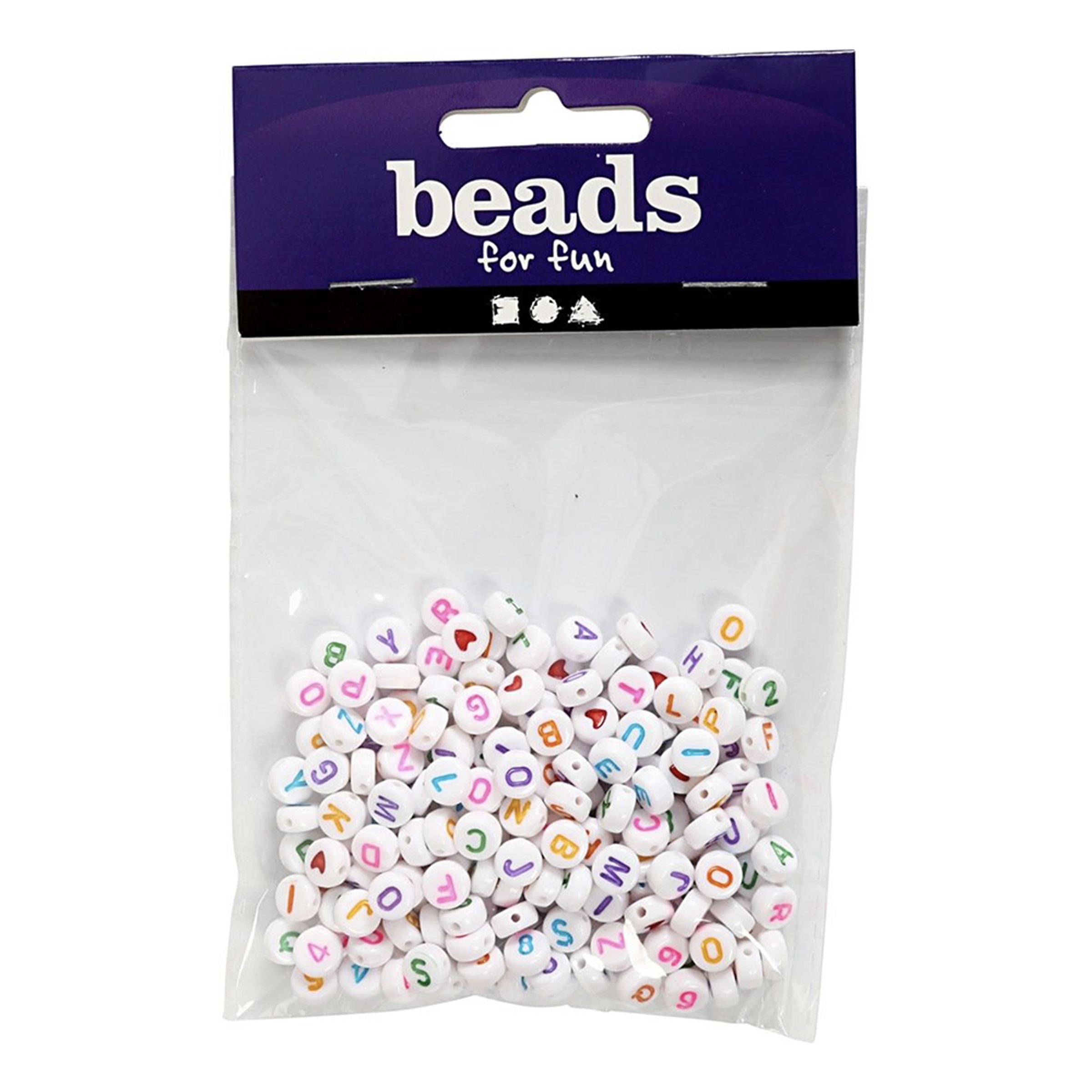 Bokstavspärlor Flerfärgade levereras som ett 200-pack och består av runda pärlor med alfabetet och siffror. Alla pärlor är tillverkad i plast med prägling och olikfärgat tryck på den platta fram- och baksidan. Ett tecken finns per pärla. Mått: 7 mm.