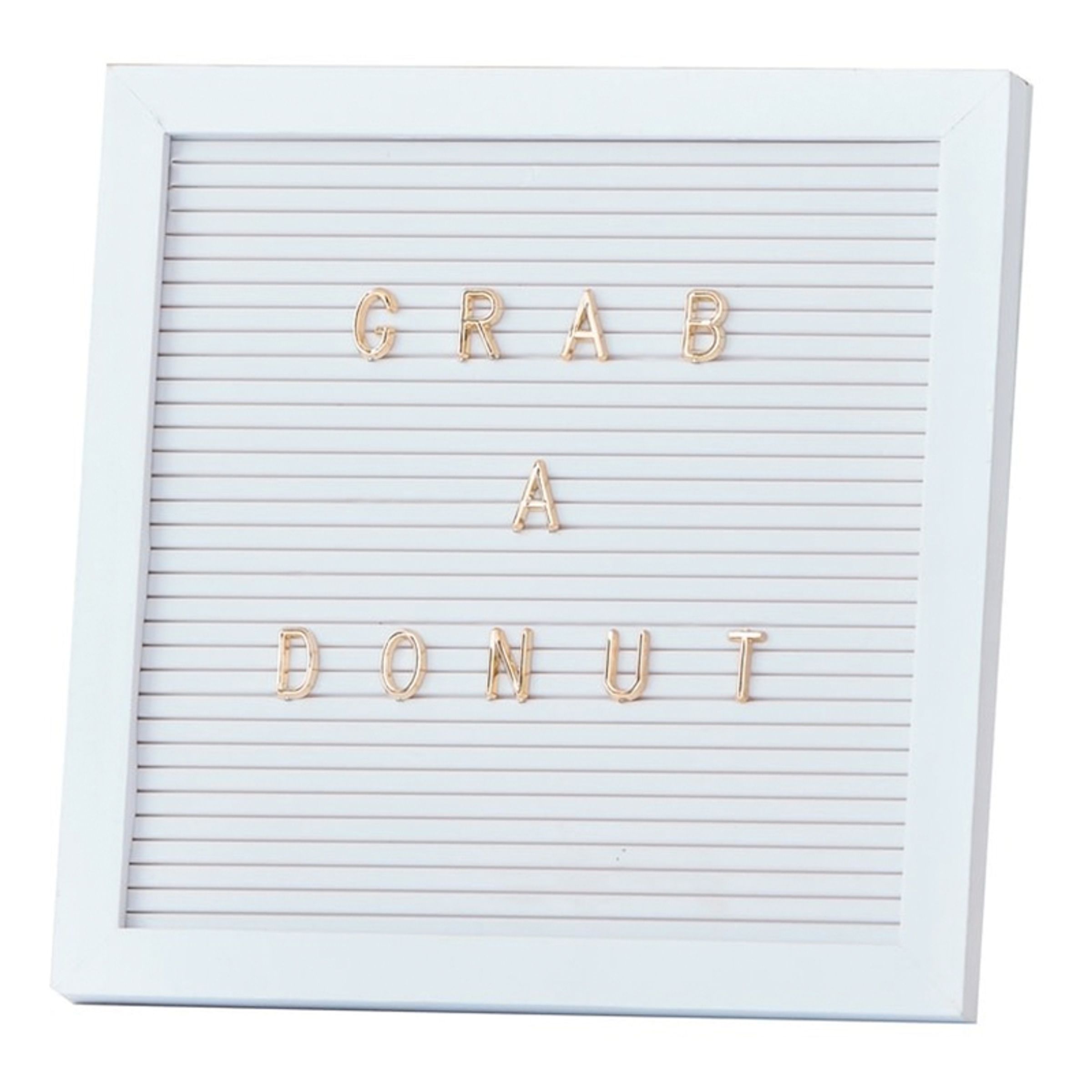 Bokstavstavla Guld innehåller en vit tavla där man kan trycka fast bokstäver för att bilda olika ord och hälsningar. Tavlan är 25 x 25 x 2 cm. 161 stycken guldfärgade bokstäver och siffror ingår (A-Z och 0-9).