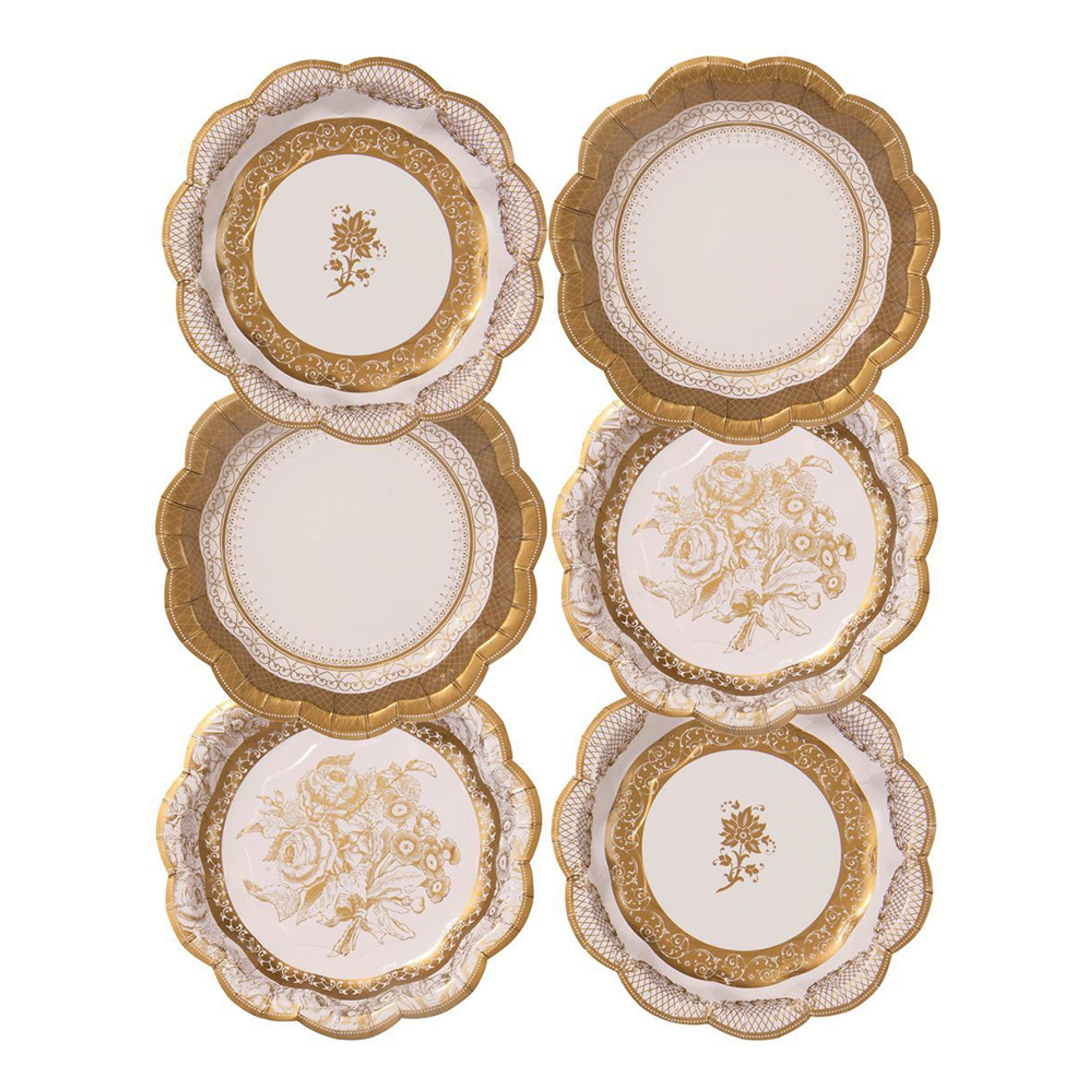 Festliga kalas kräver riktigt snygga tallrikar. Precis som de här! De eleganta assietterna med guldfärgat mönster längs kanterna passar perfekt att duka med på ett bröllop, en nyårsfest eller på en mycket elegant middag. På tallrikarna kan du servera en god förrätt eller en läcker dessert. Dina gäster kommer inte märka att det faktiskt är papptallrikar!