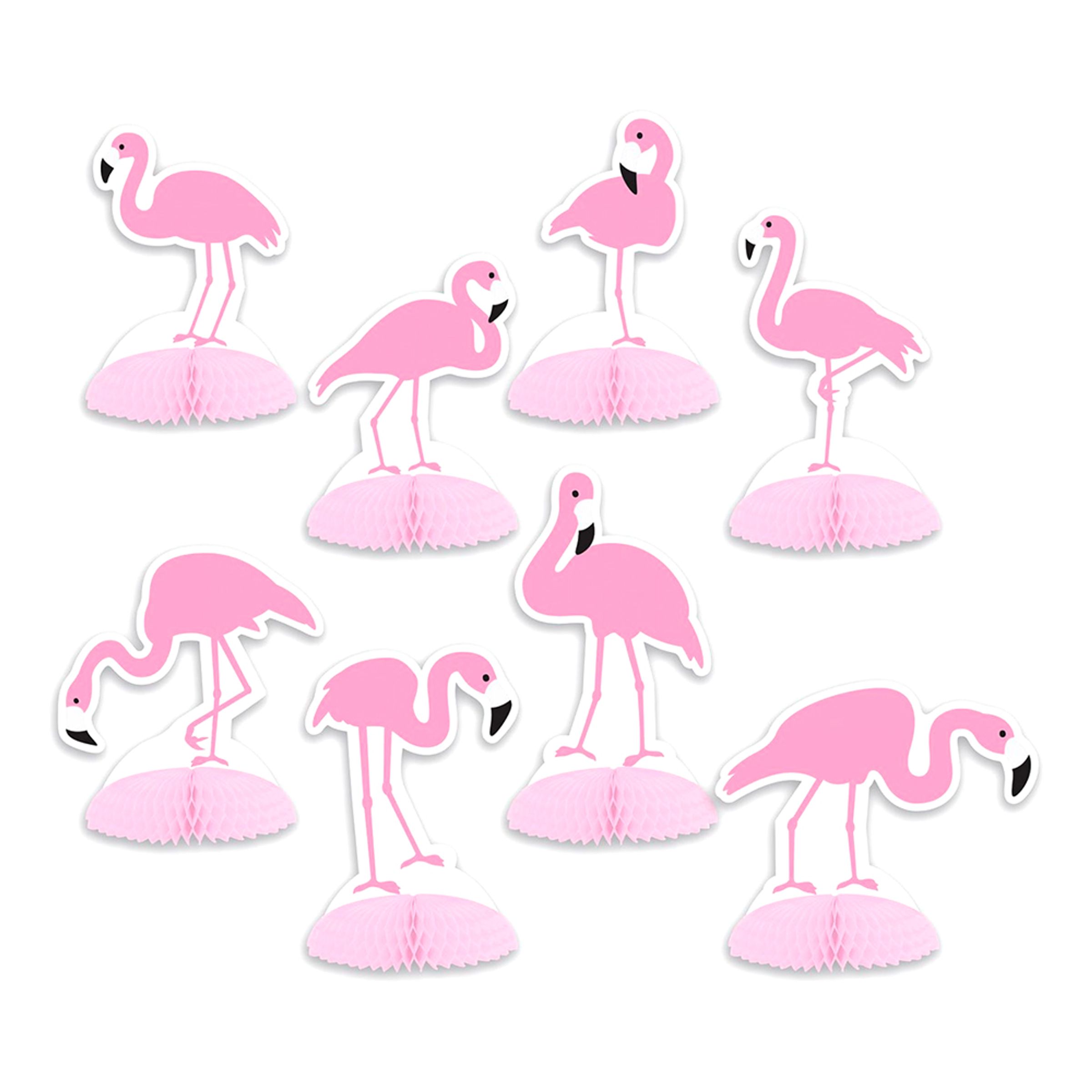 Bordsdekoration Flamingo Mini är rosa pappersdekorationer i formen av flamigos. Dekorationerna är i varierande storlek mellan 12 cm och 16 cm. Inkluderar 8 stycken flamigos.