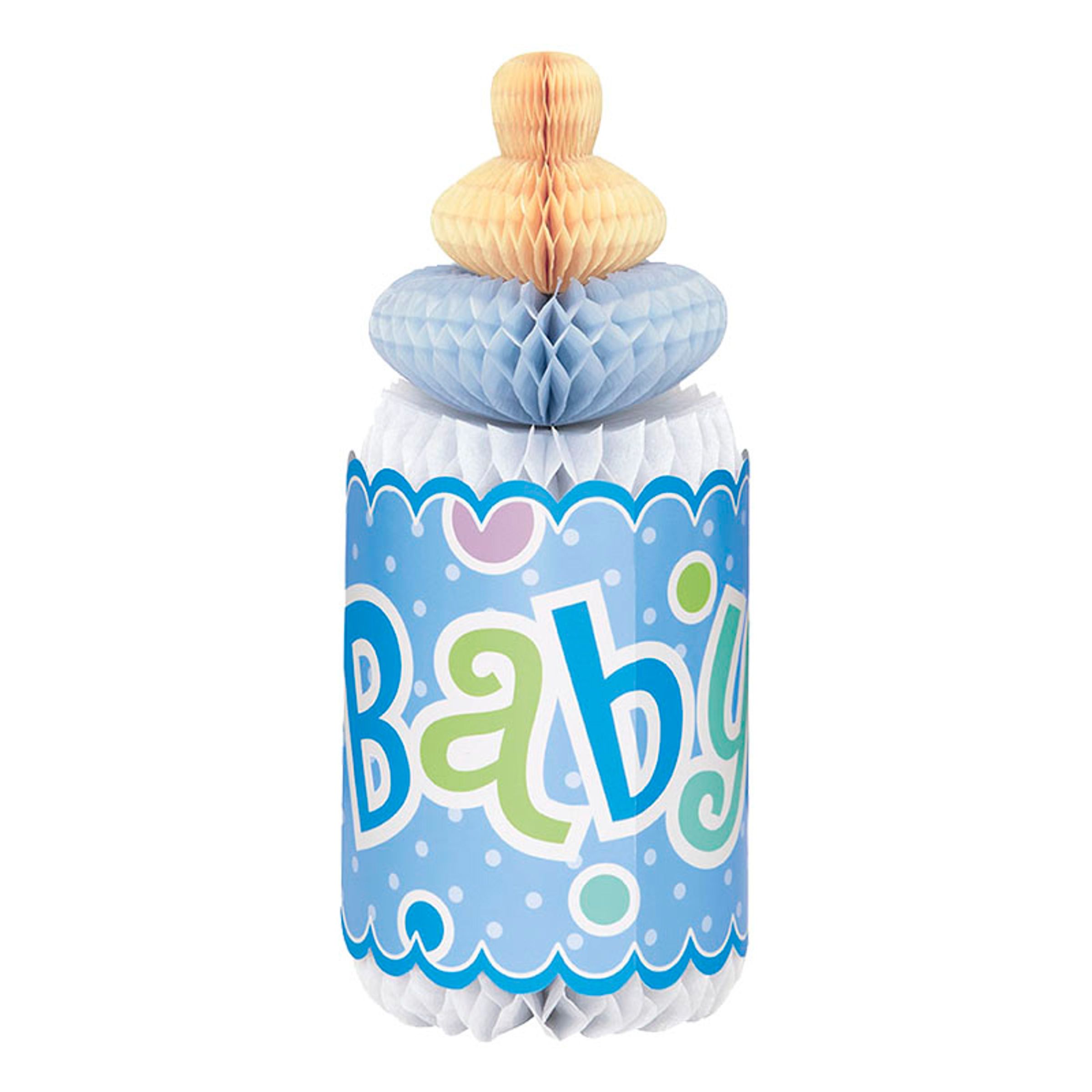 Bordsdekoration Nappflaska Honeycomb Blå gör dukningen roligare och höjer stämningen. De passar perfekt för babyshowers, dop och barnkalas. Finns även som rosa och grön.