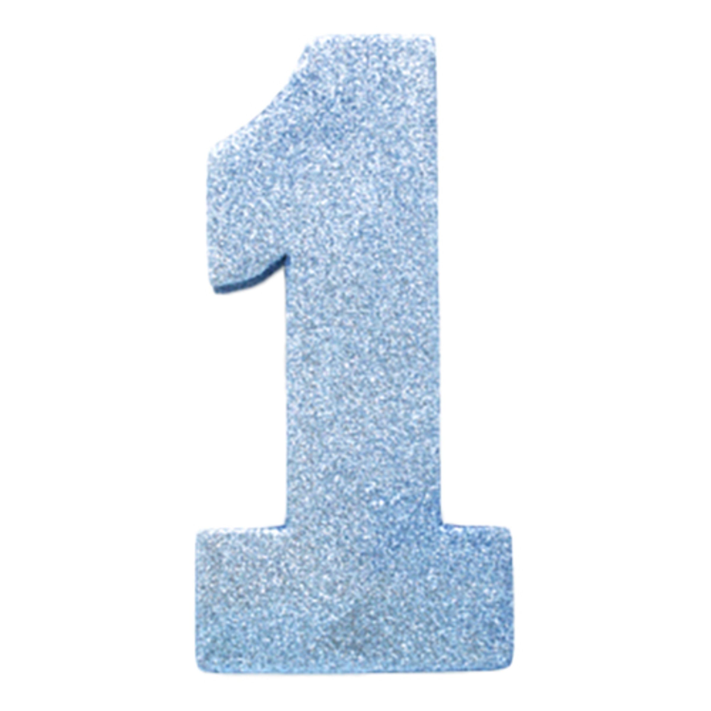 Bordsdekoration Siffra 1 Ljusblå är en ljusblå och glittrande etta. Siffran är tillverkad i EVA-skumplast och är 10 x 20 x 3 cm stor.