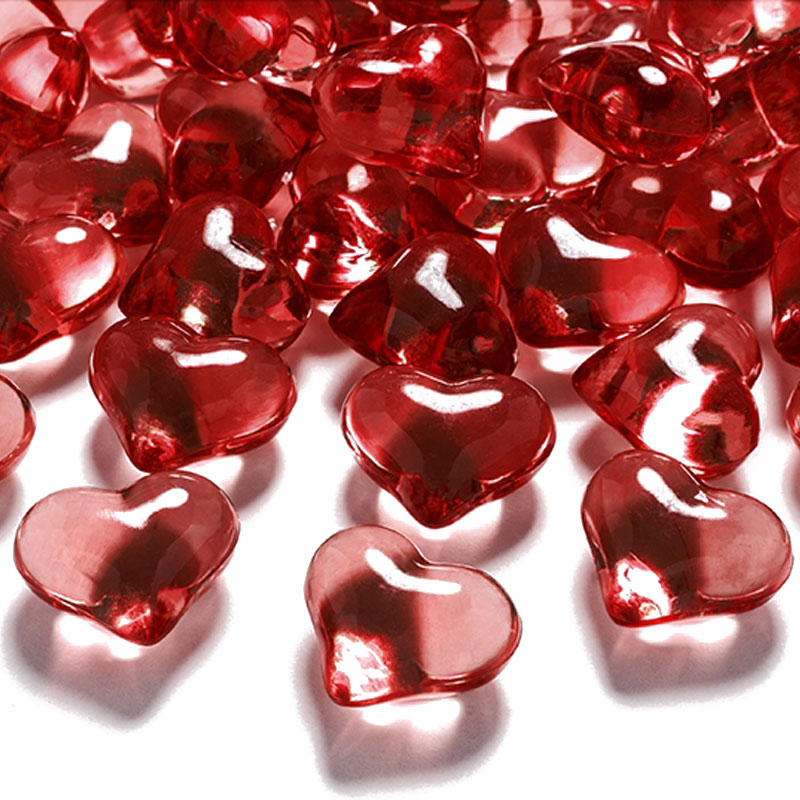 Bordsdekorationer Hjärtan Röda är genomskinliga och omfattar röda hjärtan tillverkade av hårt plastmaterial med en skimrande effekt.