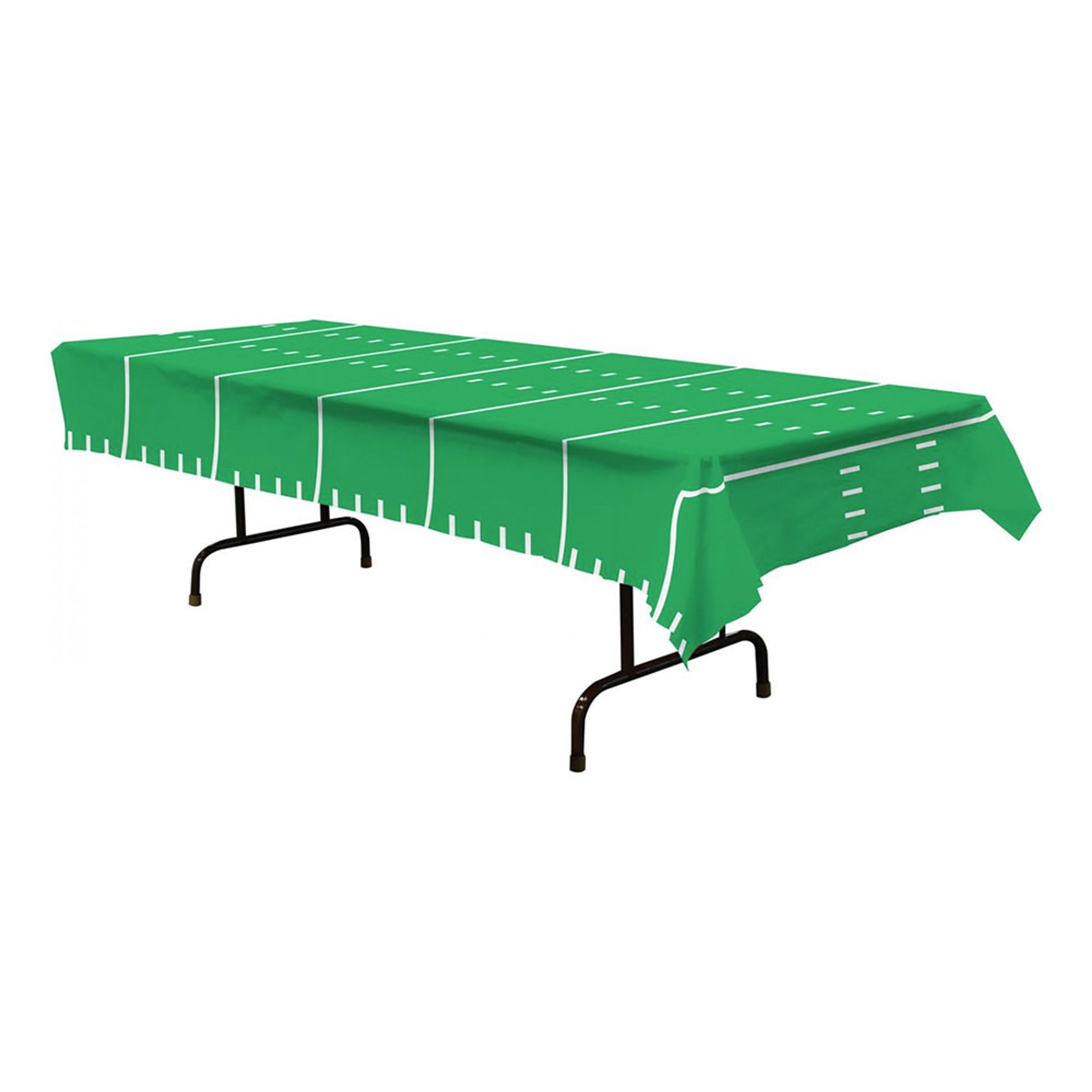 Bordsduk Amerikansk Fotbollsplan är en plastduk med måtten 137 x 274 cm. Den är grön som gräs och har vita streck, precis som en amerikansk fotbollsplan. Observera att duken är något genomskinlig då den är av tunt plastmaterial.