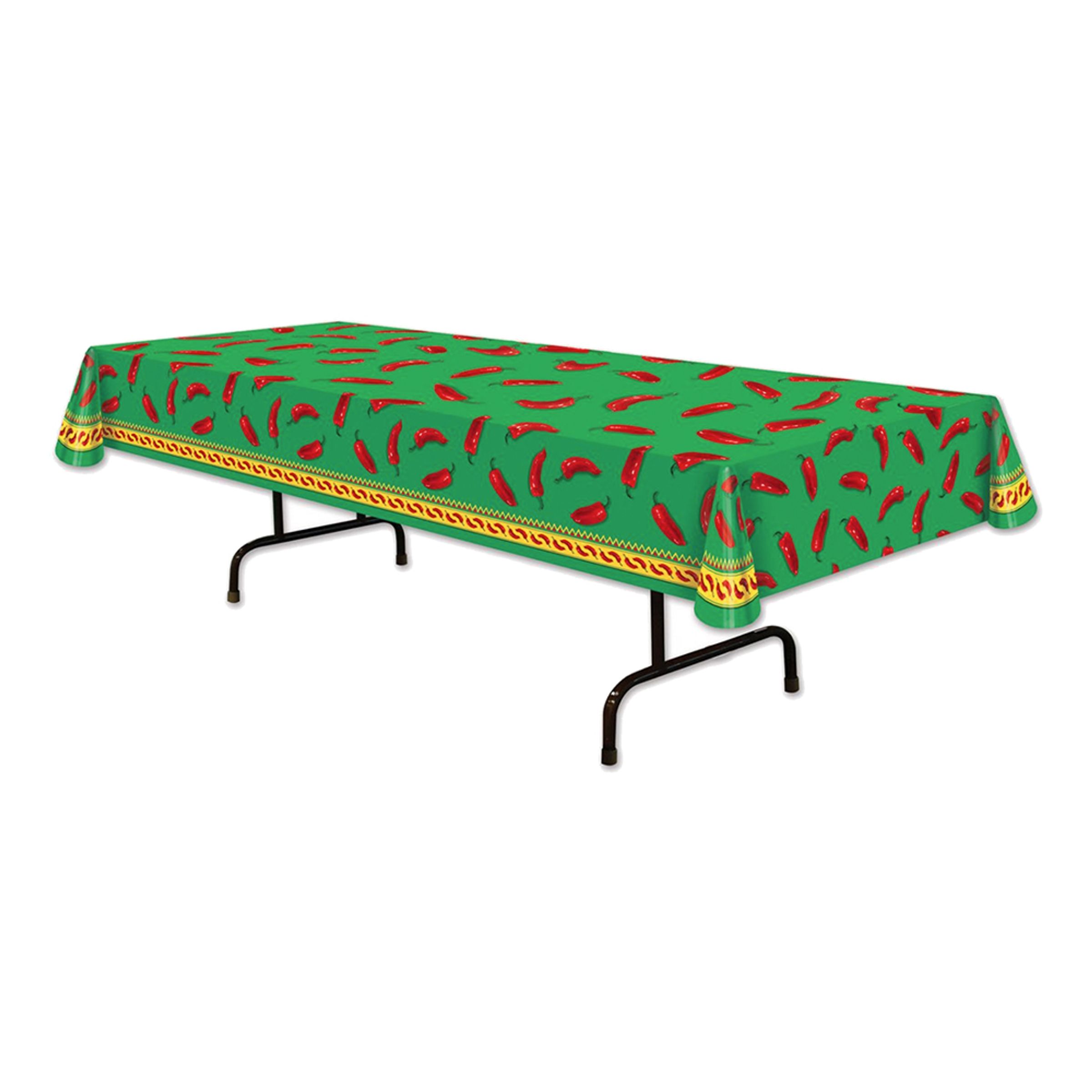 Den här färgglada duken med chilifrukter passar perfekt att lägga på bordet på en fest med mexikanskt tema eller på fredagens tacomiddag med familjen. En plastduk är bra på många sätt. Den ser snygg ut, den kan användas både inomhus och utomhus och den är enkel att torka av om man råkar spilla mat eller dryck på den.