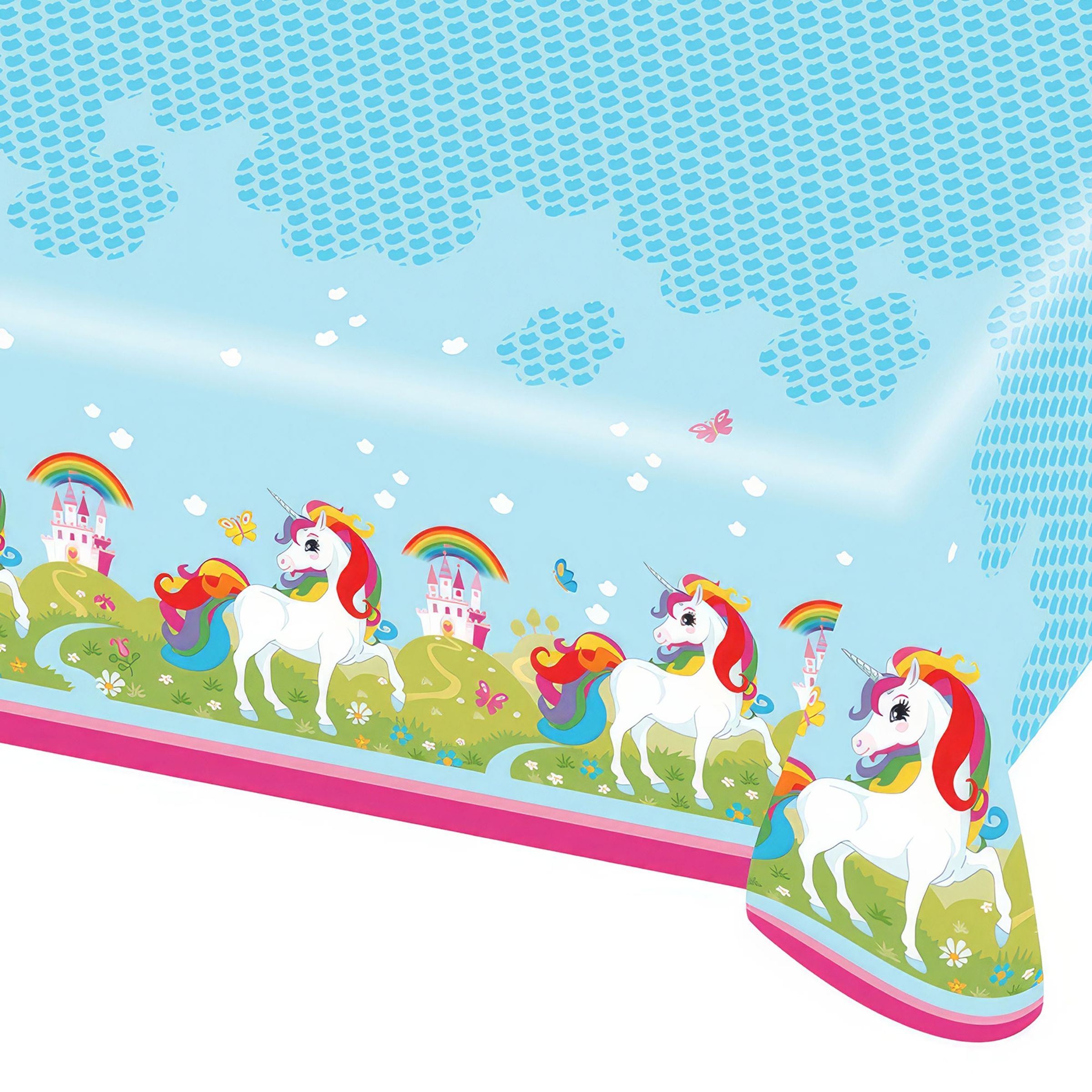 Bordsduk Enhörning med Fjäril är en blå duk med ett vacker motiv med fjärilar, enhörningar, regnbågar och slott på sidorna. Duken är tillverkad i plast och den är 120 x 180 cm stor. Den kan användas flera gånger.