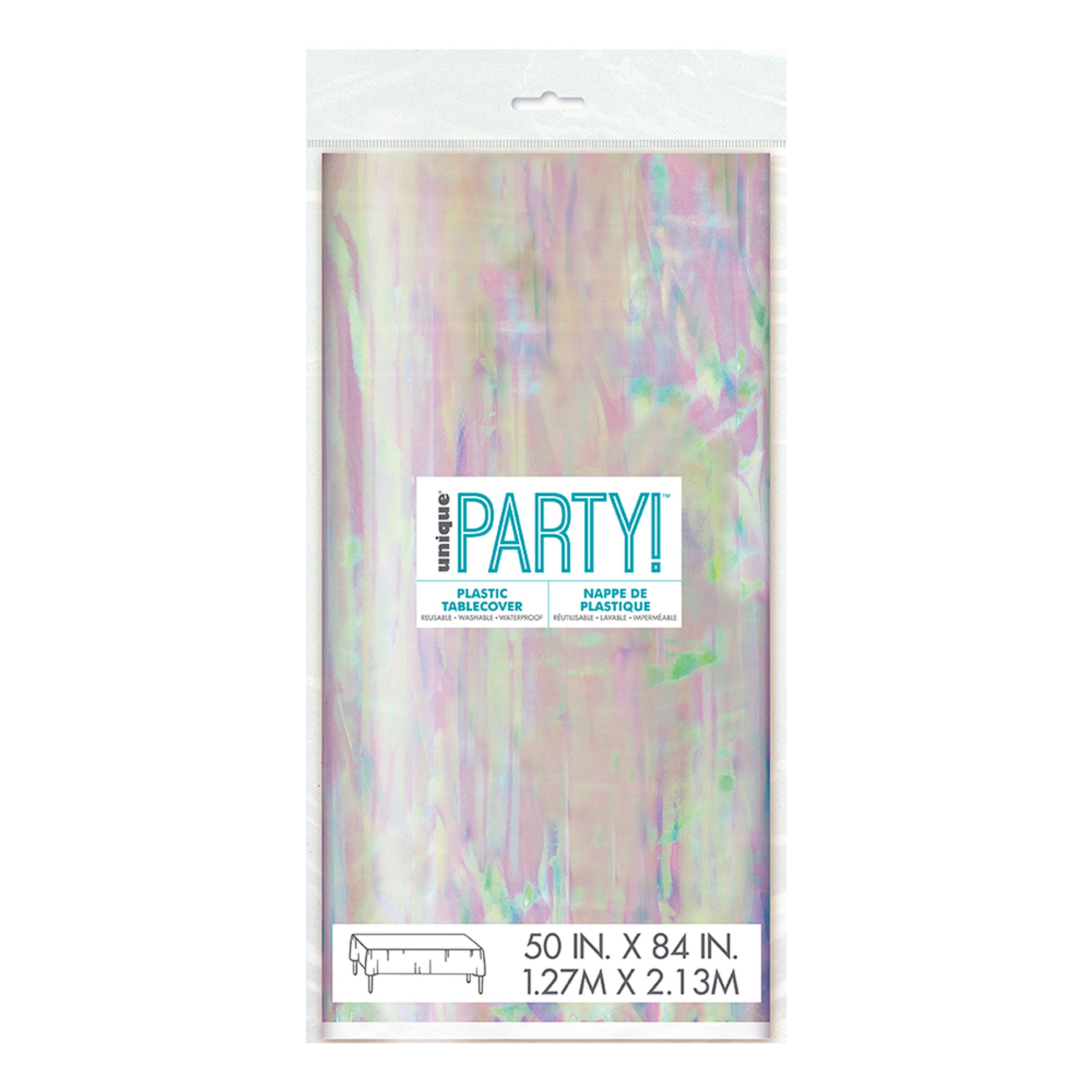 Bordsduk Färgskimrande mäter 127 cm x 213 cm. Duken är tillverkad i plast och skimrar i olika färger. Den passar perfekt att använda vid alla festliga tillfällen.