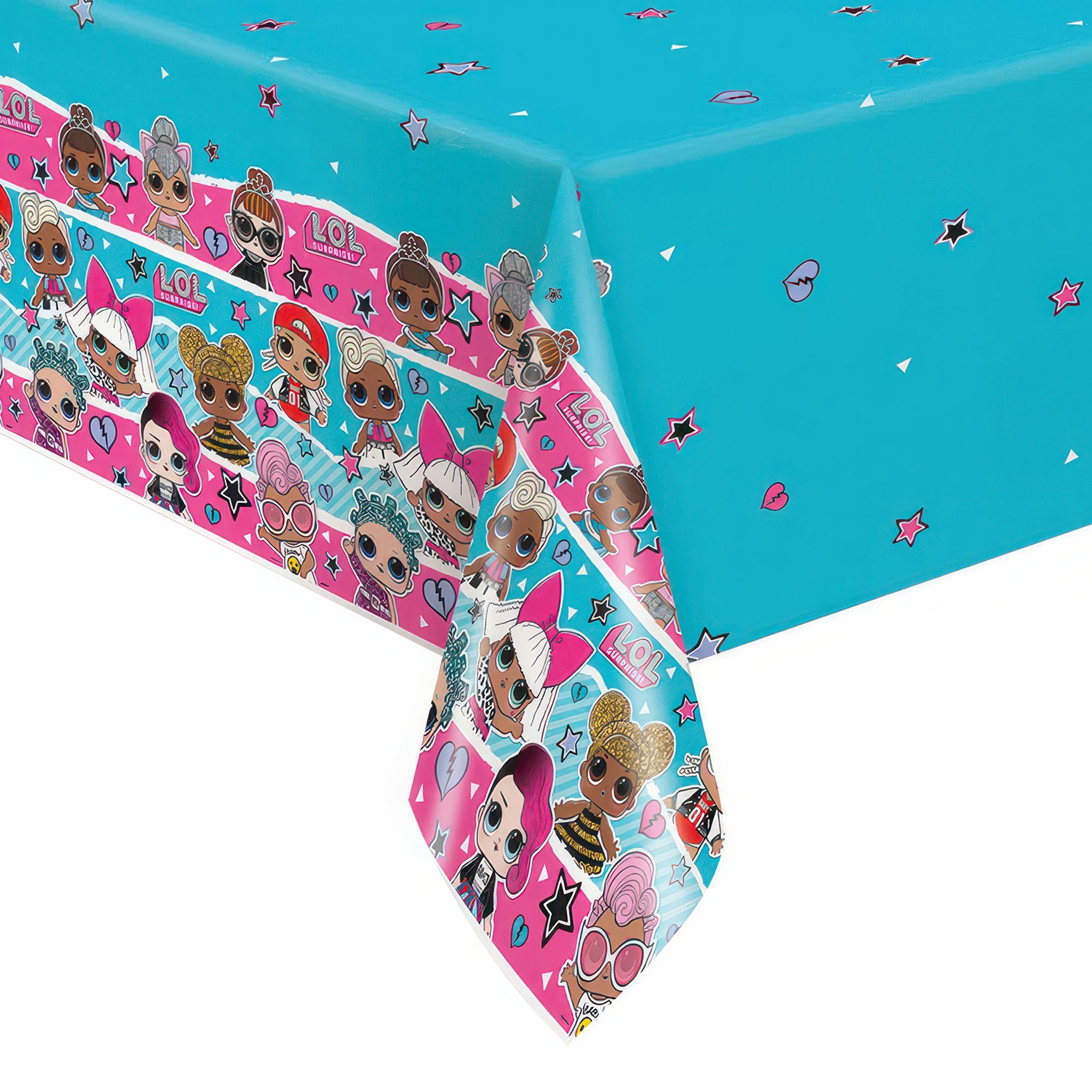 Bordsduk LOL Surprise mäter 137 cm x 213 cm. Duken är tillverkad i tunn plast. Den är är färgglad och dekorerad med dockorna från LOL Surprise längs långsidorna.