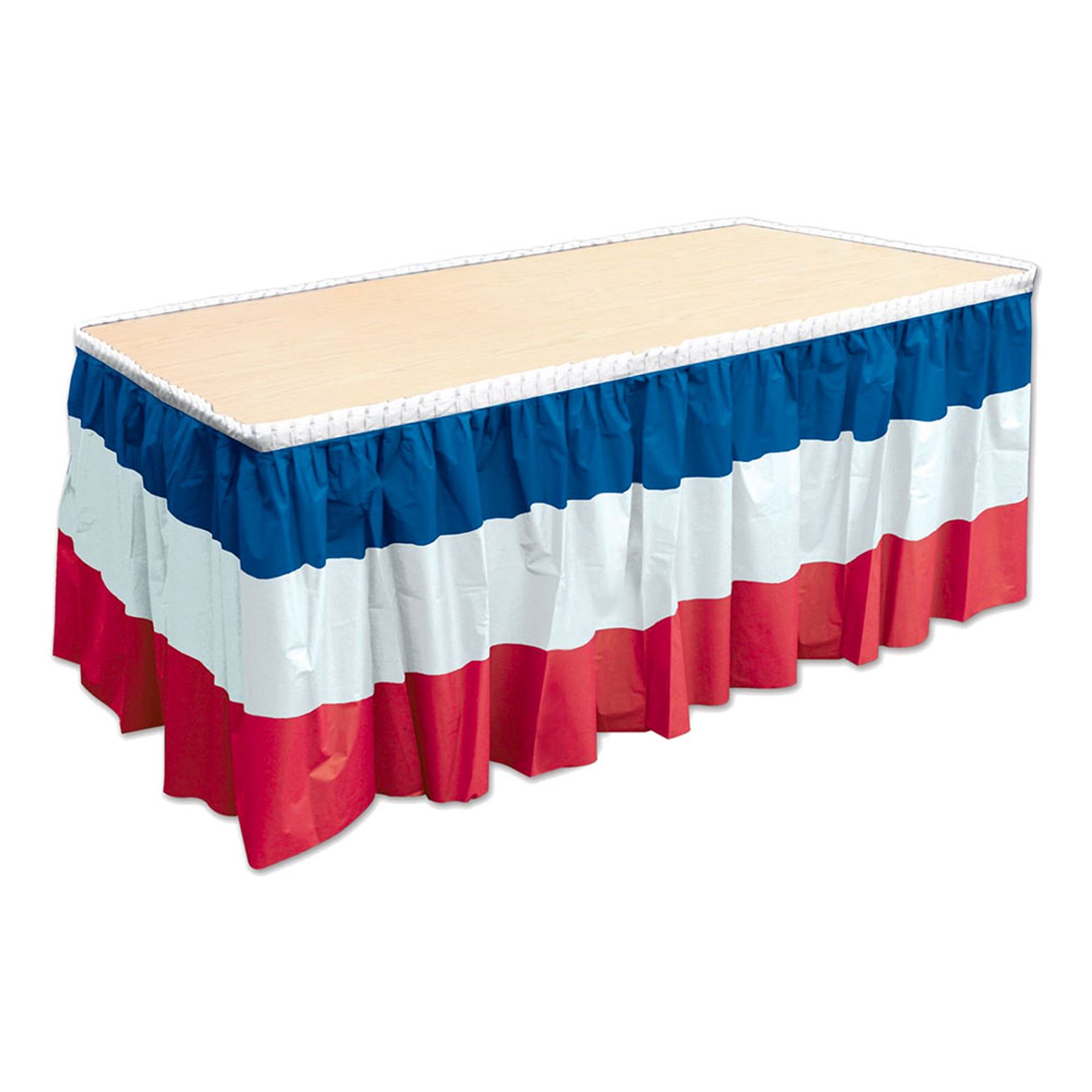 Bordskjol Röd/Vit/Blå är självhäftande längs den övre kanten. Bordskjolen kan exempelvis användas vid firande av Norges, USA:s eller Frankrikes nationaldagar.