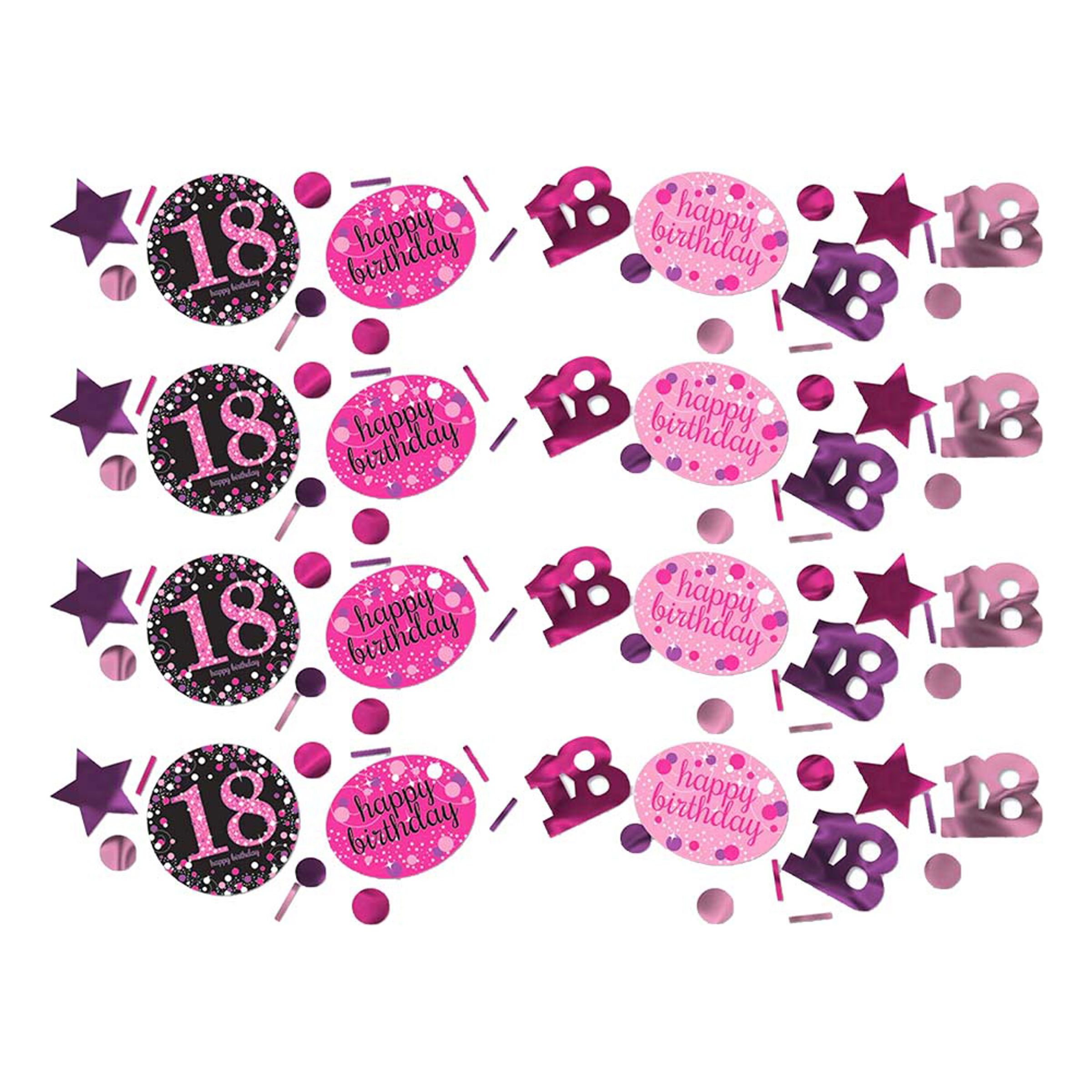 Bordskonfetti 18 Svart/Rosa Glitter inkluderar 34 gram konfetti med olika motiv som "Happy Birthday", "18" och stjärnor. Den här konfettin i svart och rosa är idealisk att dekorera med på ett 18-årskalas!