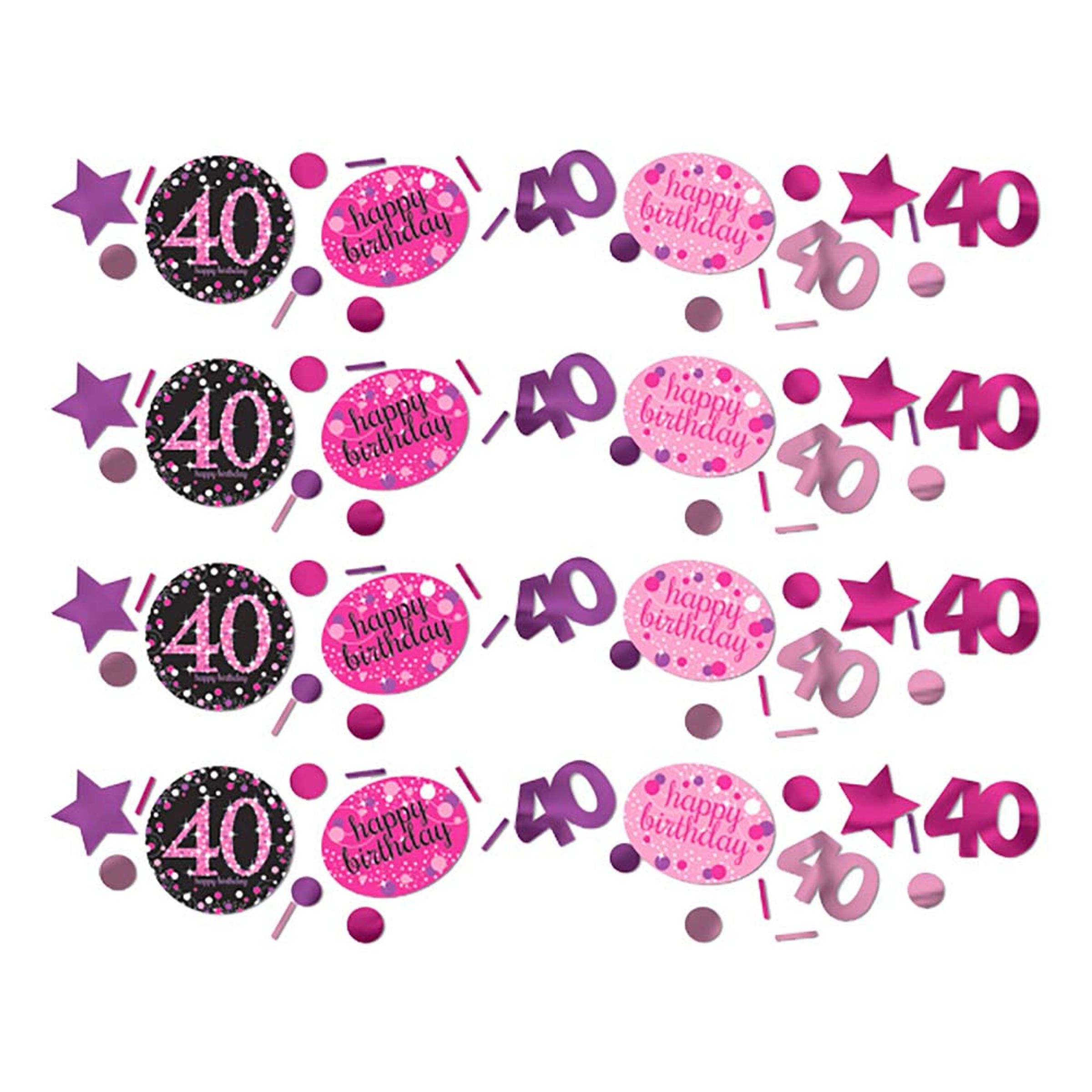 Bordskonfetti 40 Svart/Rosa Glitter inkluderar 34 gram konfetti med olika motiv som "Happy Birthday", "40" och stjärnor. Den här konfettin i svart och rosa är idealisk att dekorera med på ett 40-årskalas!