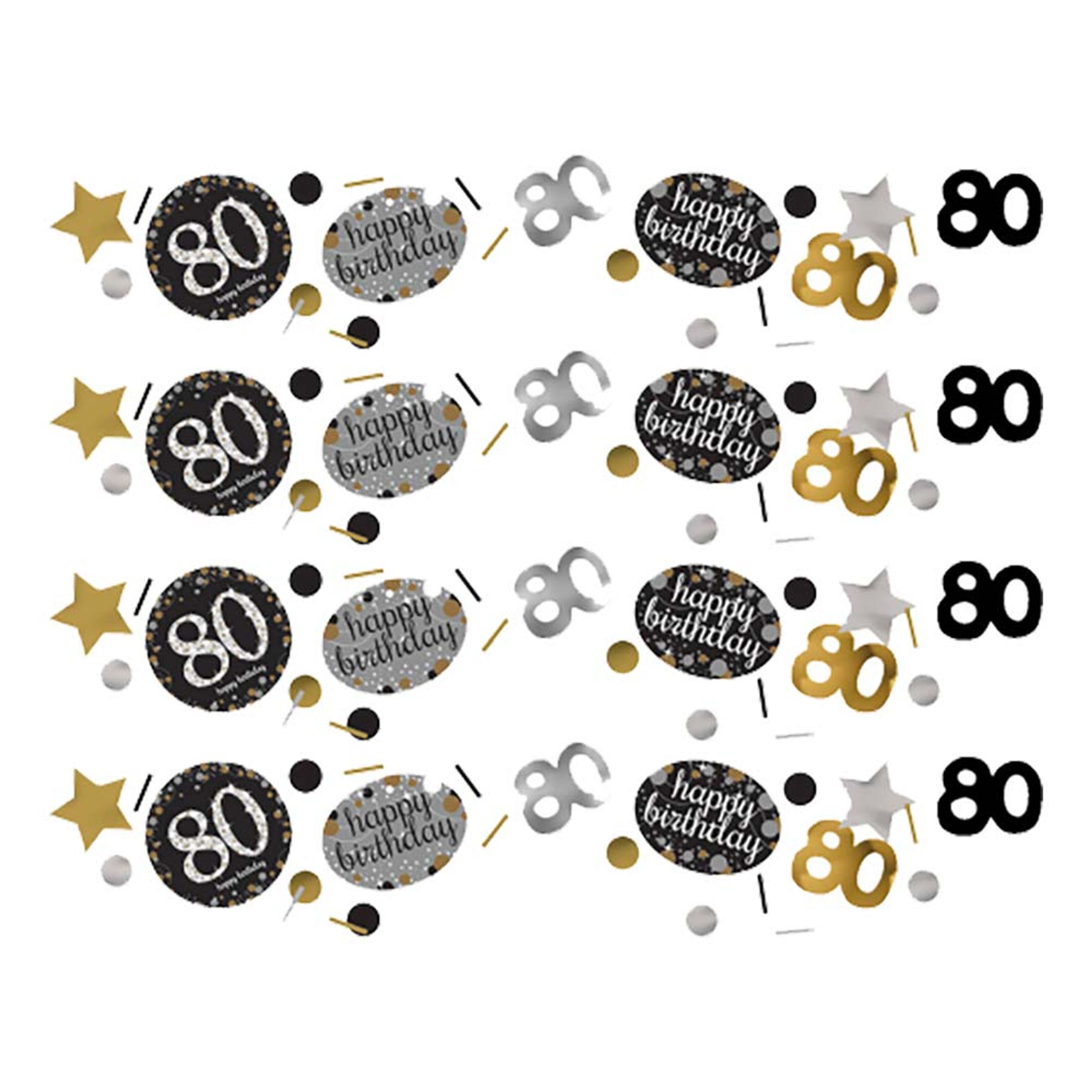 Bordskonfetti 80 Silver/Guld Glitter inkluderar 34 gram konfetti med olika motiv som "Happy Birthday", "80" och stjärnor. Den här konfettin i svart, silver och guld är idealisk att dekorera med på ett 80-årskalas!
