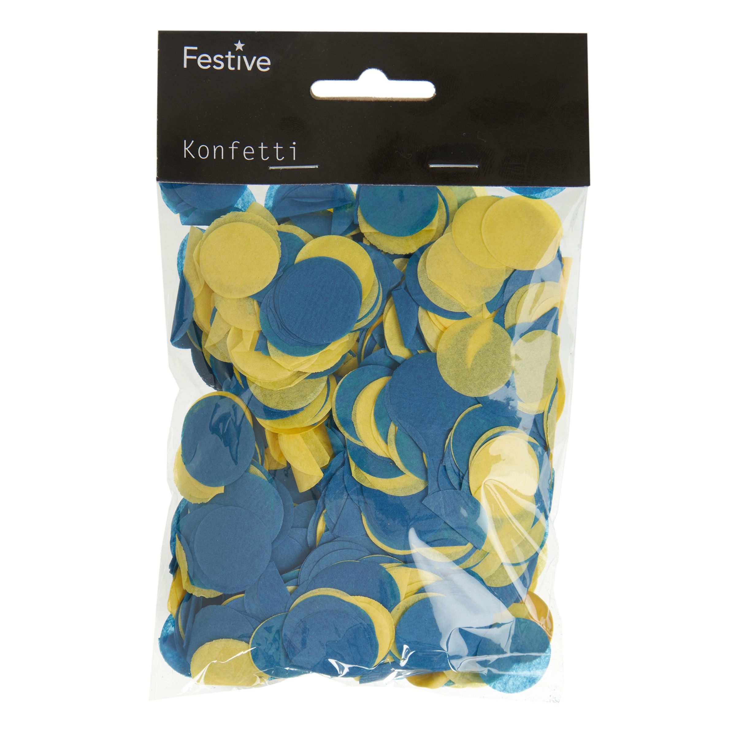 Bordskonfetti Blå/Gul innehåller 36 gram konfetti i färgerna blå och gul. Konfettin är rund och tillverkad av silkespapper. OBS! Kan färga av sig i kontakt med vätska.