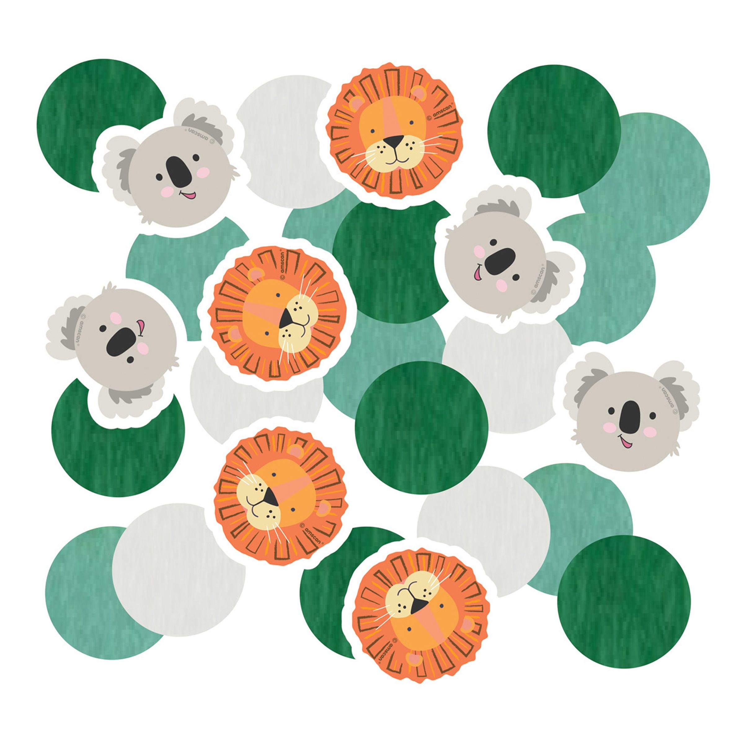 Bordskonfetti Djungeldjur innehåller rund konfetti i papper. Konfettin har blandad konfetti med runda cirklar i grönt samt lejon- och koala huvuden.