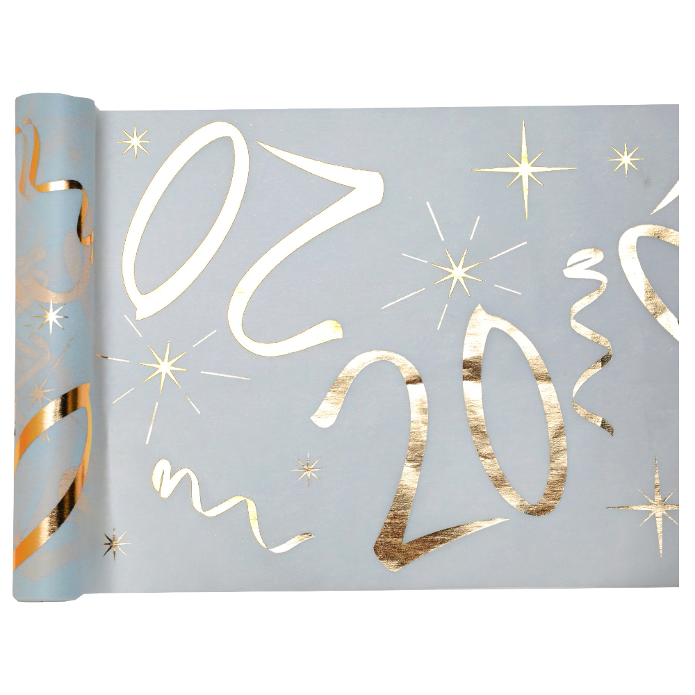 Bordslöpare 20 År Sparkle omfattar en vit engångs-bordslöpare med guldig "20" text samt guldiga motiv av stjärnor och serpentiner. Bordslöparen är tillverkad av non-woven polyester och är ca 30 cm bred samt 5 meter lång.