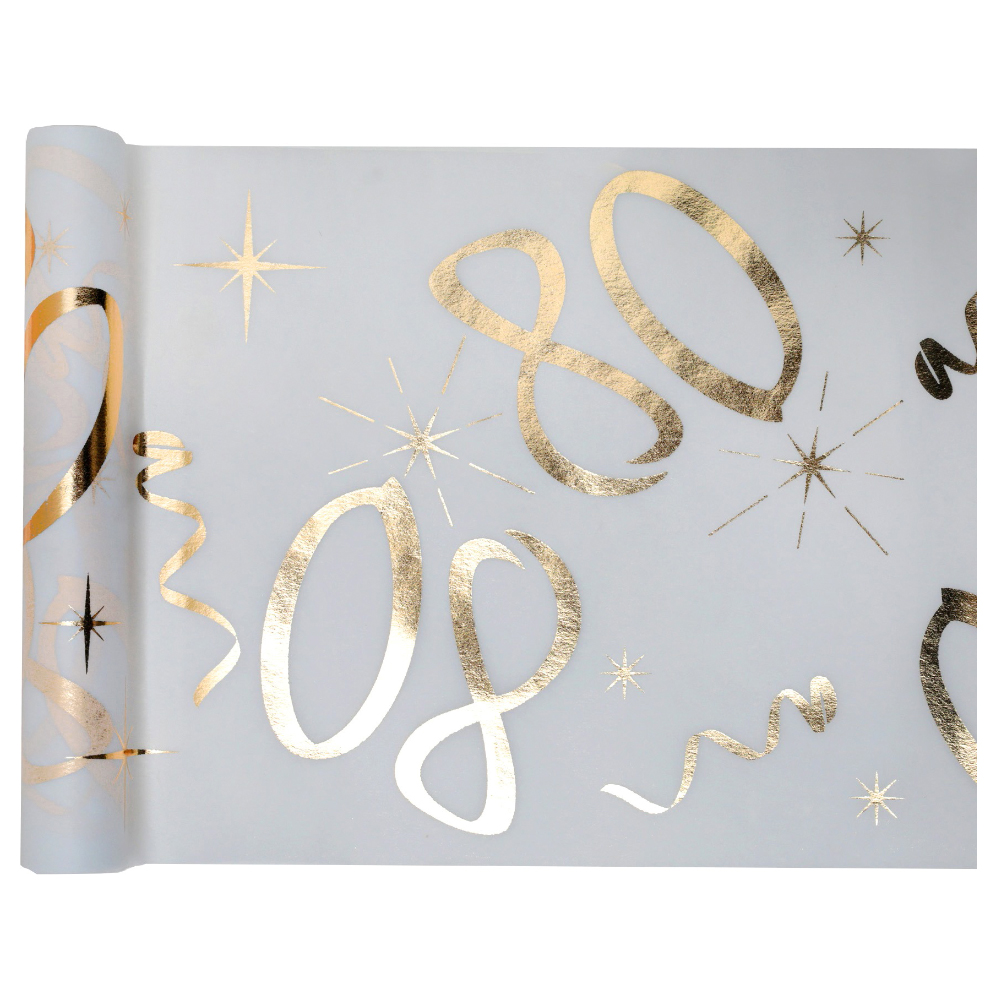 En extra snygg födelsedagsdukning är enkelt att få till med en fin bordslöpare som denna! Supertjusig 80-års bordslöpare i vitt och skimrande guld som ger dukningen det där lilla extra. Lägg engångsduken på bordet och duka upp med andra Sparkle dukningstillbehör och få till ett riktigt strålande kalasbord på bara några minuter!
