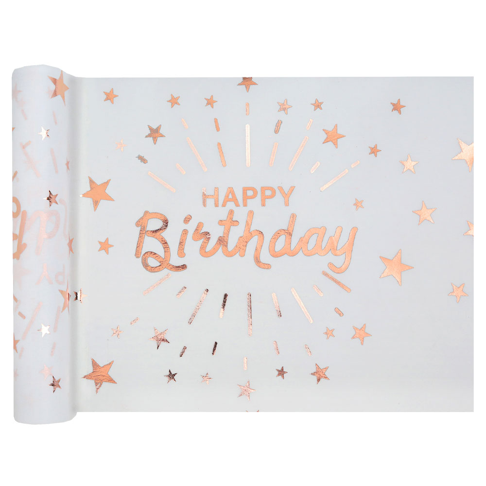 Bordslöpare Birthday Party Roseguld omfattar en vit engångsbordslöpare med roseguldig "Happy Birthday" text. Bordslöparen är tillverkad av non-woven polyester och är ca 30 cm bred samt 5 meter lång.
