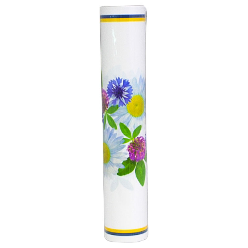 Bordslöpare Blommor omfattar en vit bordslöpare av papp med motiv av sommarblommor. Bordslöparen är ca 25 cm bred och 3 meter lång.