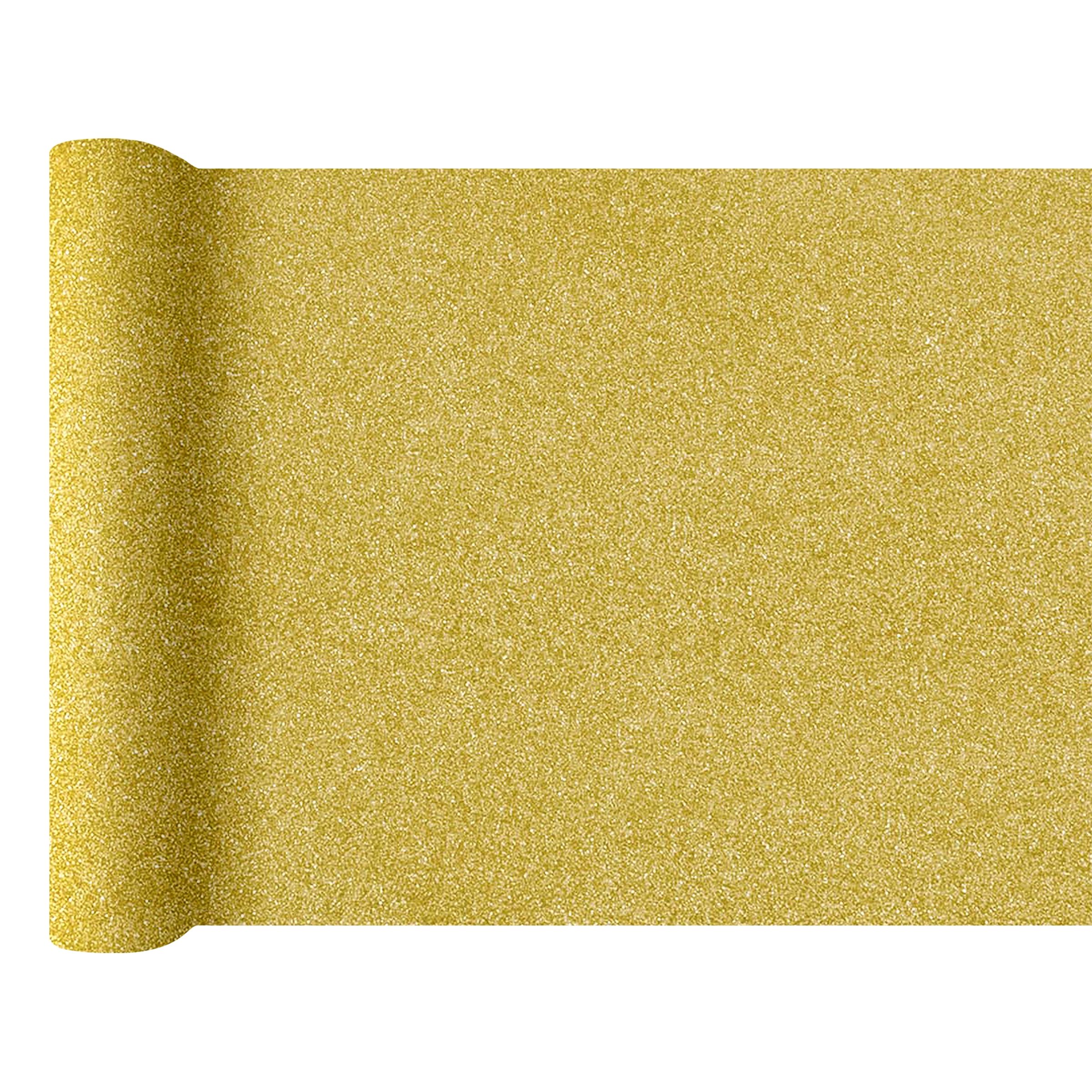 Bordslöpare Guld Glitter innehåller en rulle med en smal bordsduk som du antingen kan rulla ut på bordet som den är, eller över en vit vanlig duk för att få en ännu mer elegant look.