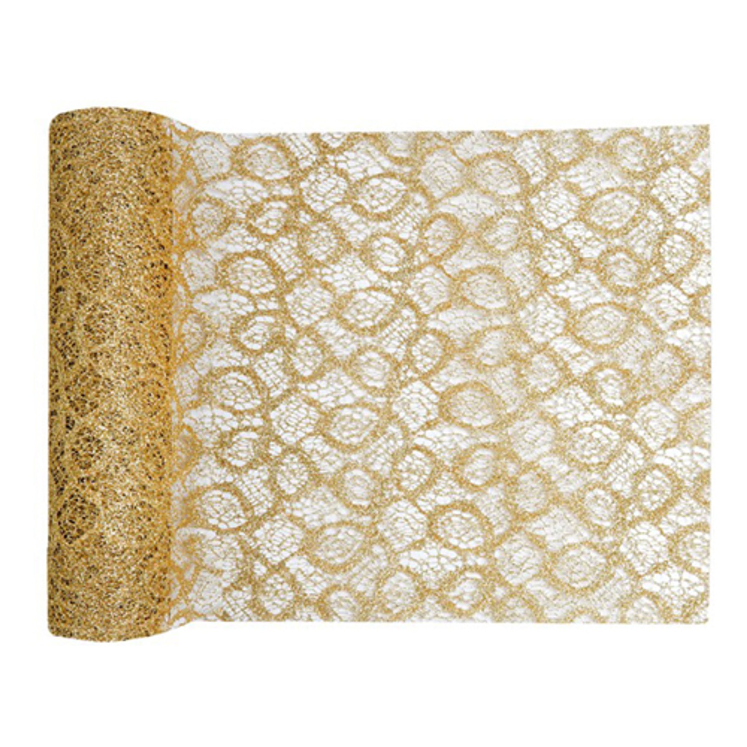 Bordslöpare Guldmönstrat är en guldfärgad duk med ett spetsliknande mönster. Duken är tillverkad i polyester och den är 28 x 500 cm stor.