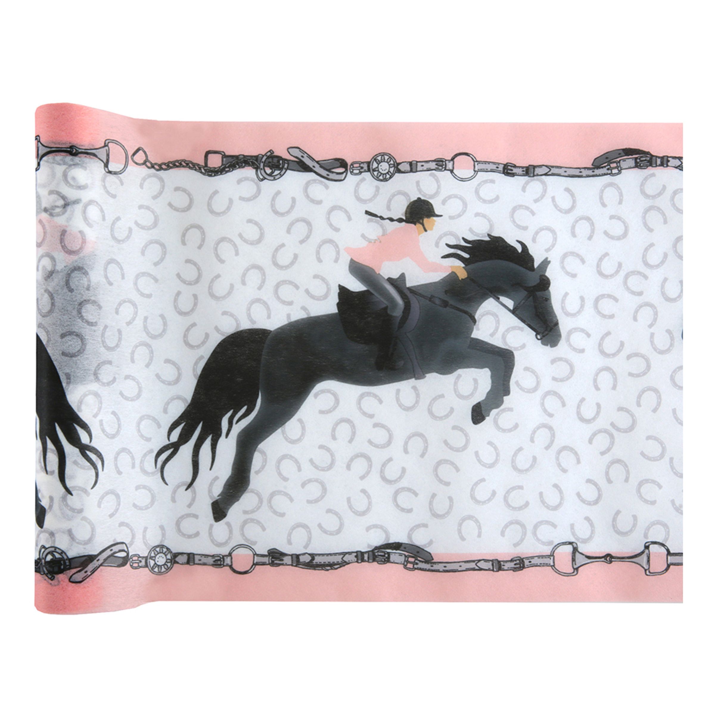 Bordslöpare Hästhopp inkluderar en rulle bordslöpare á 30 x 500 cm. Bordslöparen är tillverkad i ett högkvalitativt icke-vävt polyestermaterial och fungerar superbra till hästfesten!