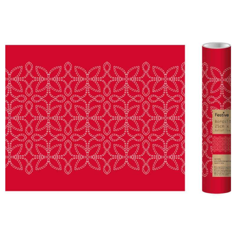 Bordslöpare Jul Röd består av en smal röd pappersduk med mönster i vitt. Bordslöparen mäter 25 centimeter bred och 3 meter lång.