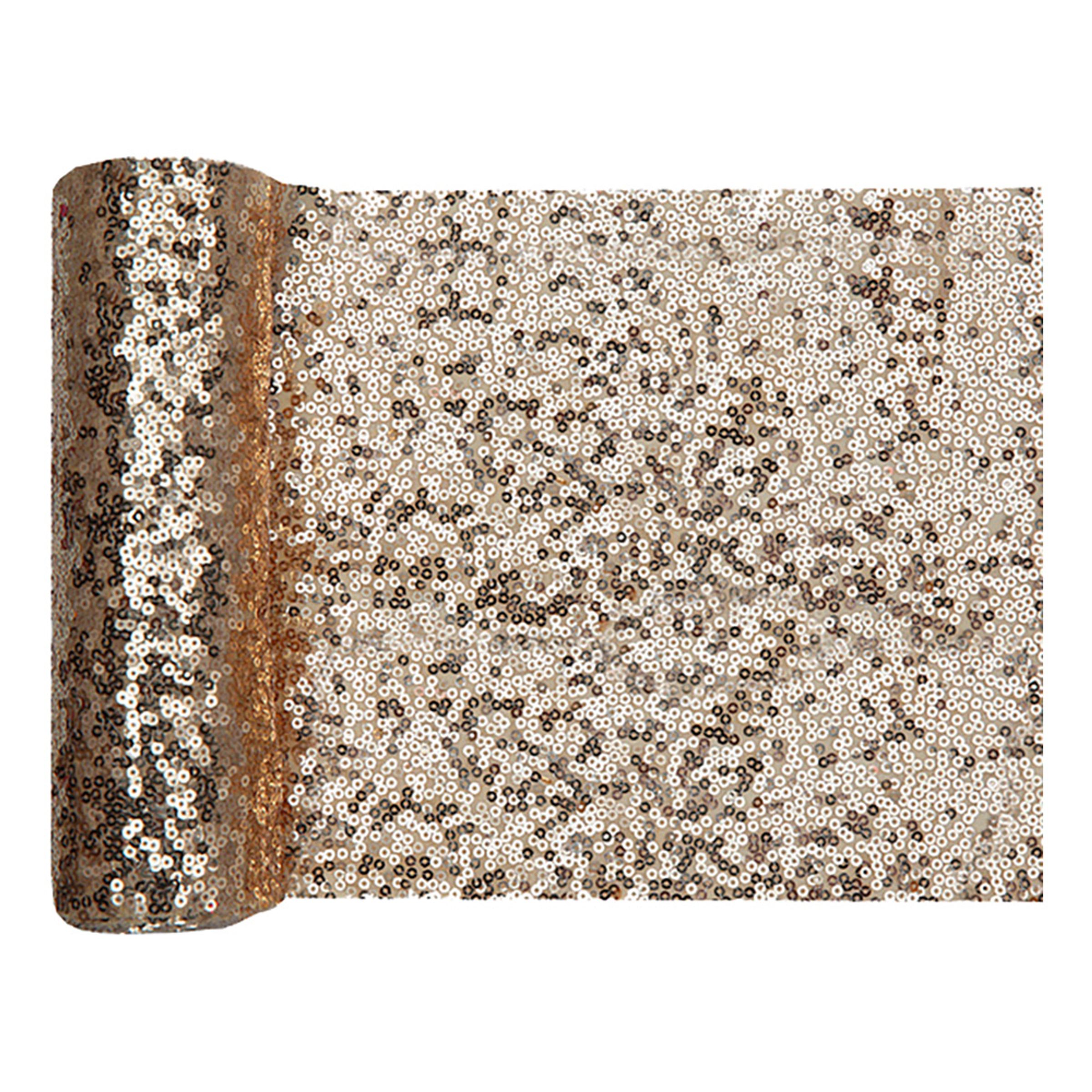 Bordslöpare Paljetter Guld är en bordslöpare som är täckt i guldiga paljetter. Tillverkad av polyester och mäter ca 300 x 19 cm. Säljs styckvis.