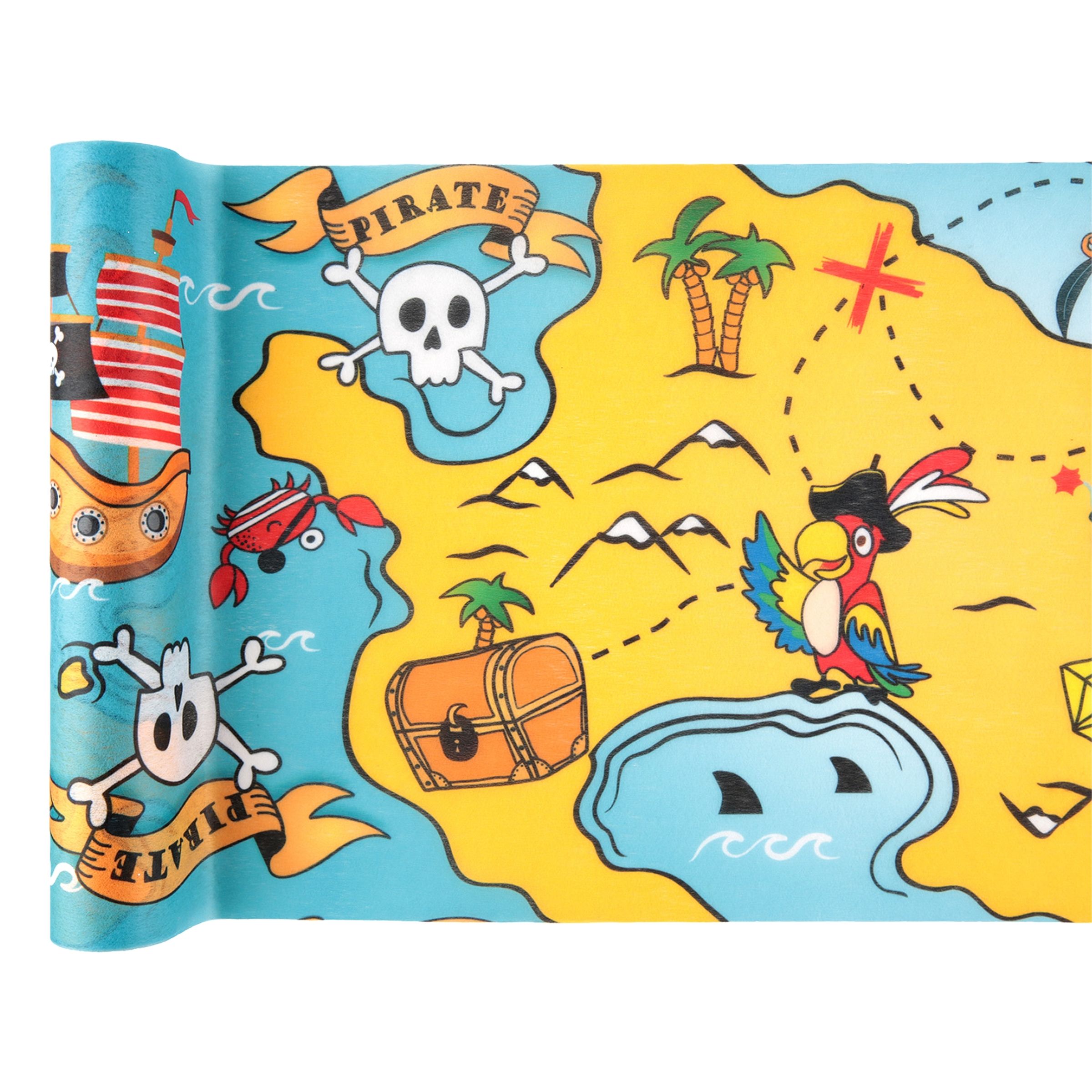 Den här färgglada och coola duken blir en festlig detalj på det dukade bordet på ett kalas med pirattema. Men duken är faktiskt inte bara en duk, det är en skattkarta också. Låt barnen följa kartan och se om de kan hitta skatten. En perfekt sysselsättning medan barnen väntar på att fikat dukas fram.