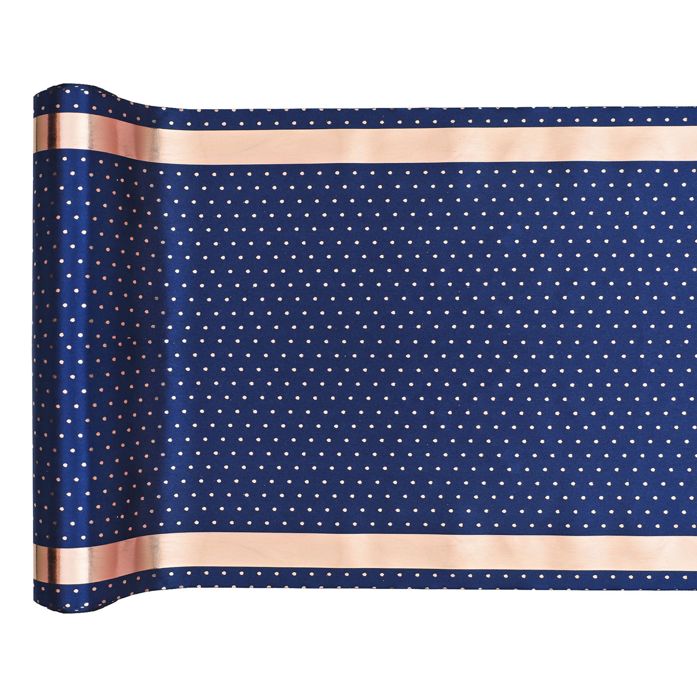 Bordslöpare Prickig Navy/Roséguld kommer i mörkblå färg med motiv av små skimrande prickar i roséguld och matchande skimrande kanter. En snygg detalj på bordet perfekt för storslagna dukningar!