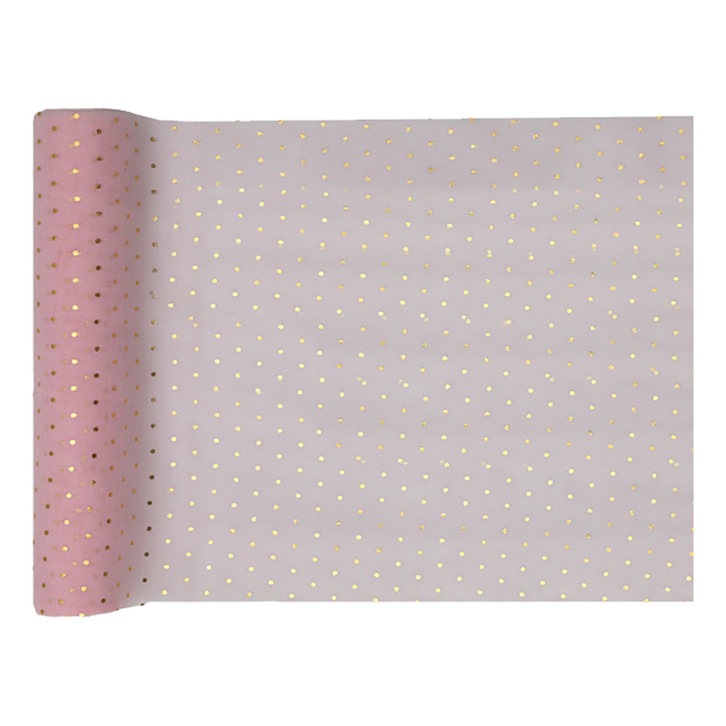 Bordslöpare prickig rosa/guld är tillverkad av gastyg, ett tunt och lätt genomskinligt tyg som känns riktigt festligt. Duken är därtill prydd av små guldiga prickar. Löpare är långsmala dukar och just den här mäter 300 x 26 centimeter.