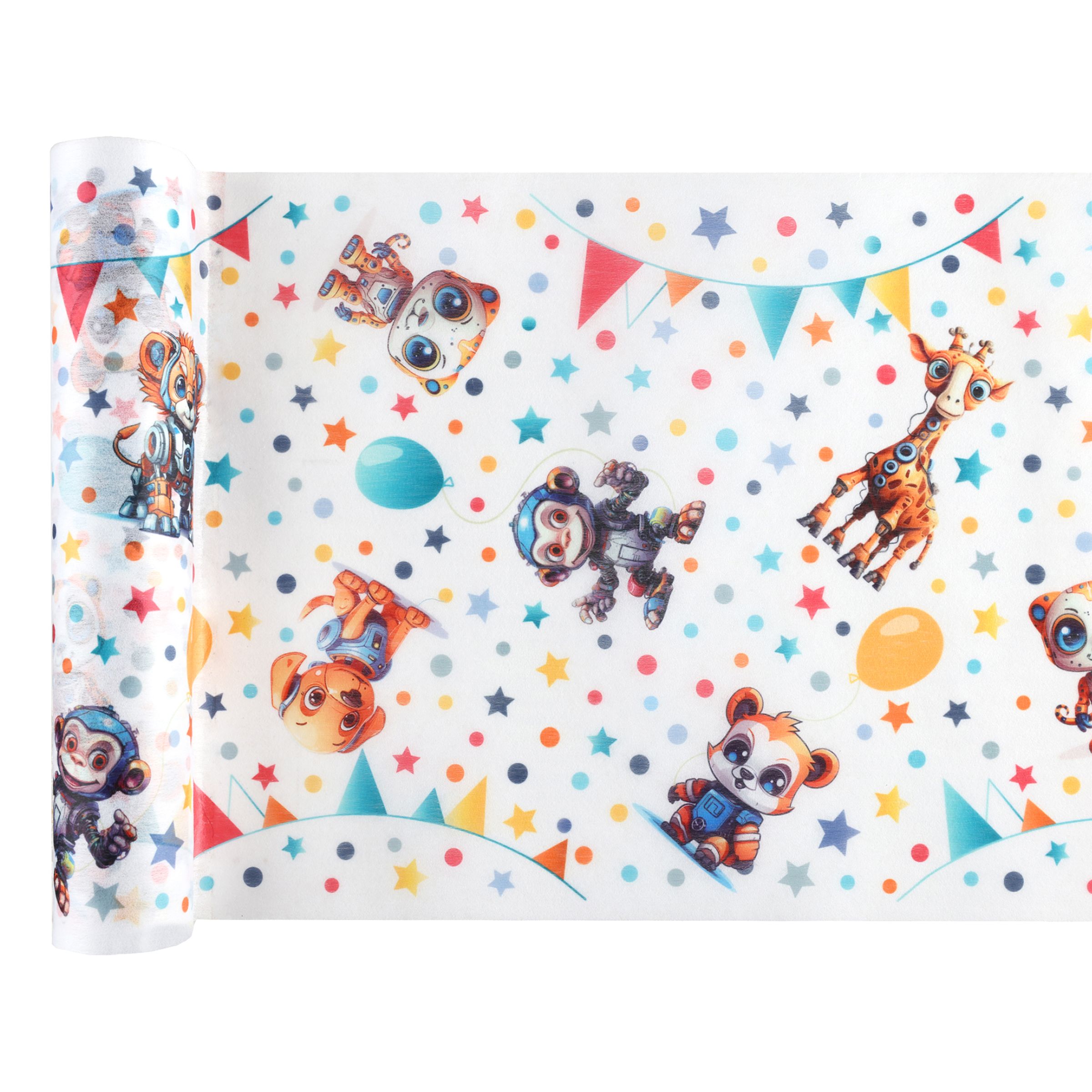 Bordslöpare Robotdjur är en vit bordslöpare tryckt med olika robotdjur och färgglatt mönster av prickar, stjärnor, vimpelgirlanger och ballonger. Festlig som få!
