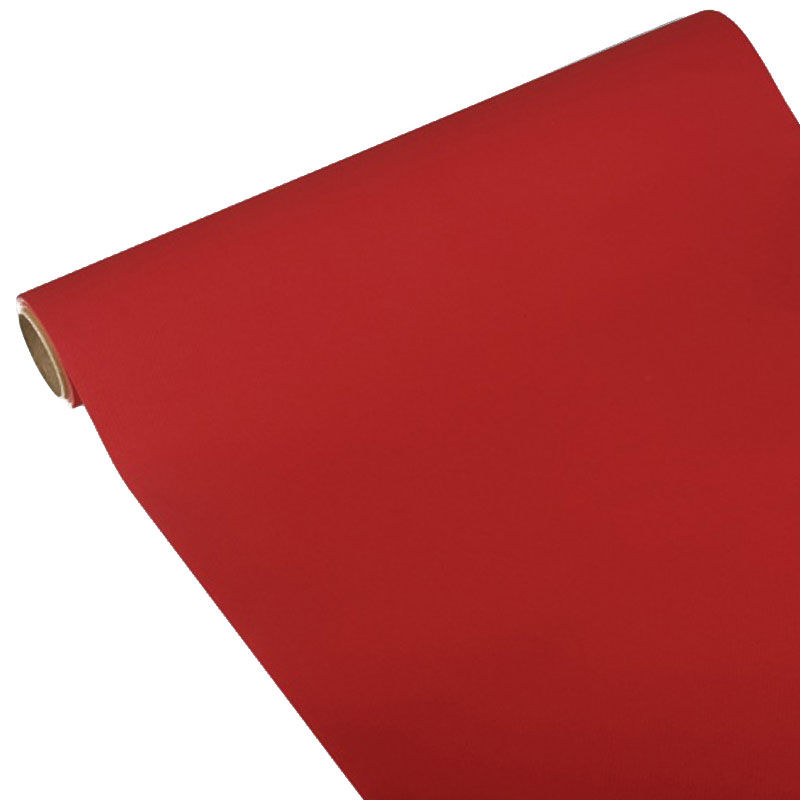 Bordslöpare Röd består av en röd slitstark tygliknande pappersduk som är tillverkad av airlaidmaterial. Löparen kommer på en praktisk rulle.