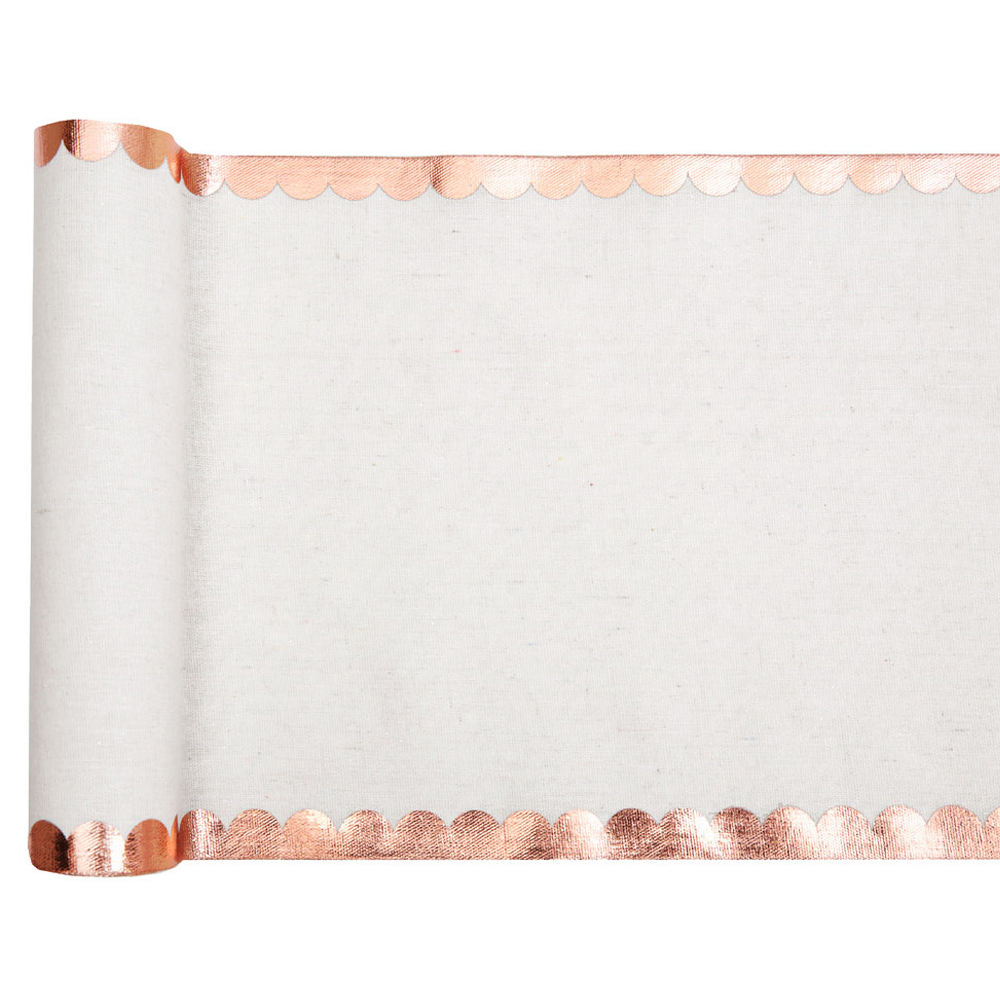 Bordslöpare Scalloped Roseguld omfattar en vit engångsbordslöpare med dekorativa kanter i skimrande roseguld. Duken är tillverkad av bomull och är ca 28 cm bred samt 3 meter lång.
