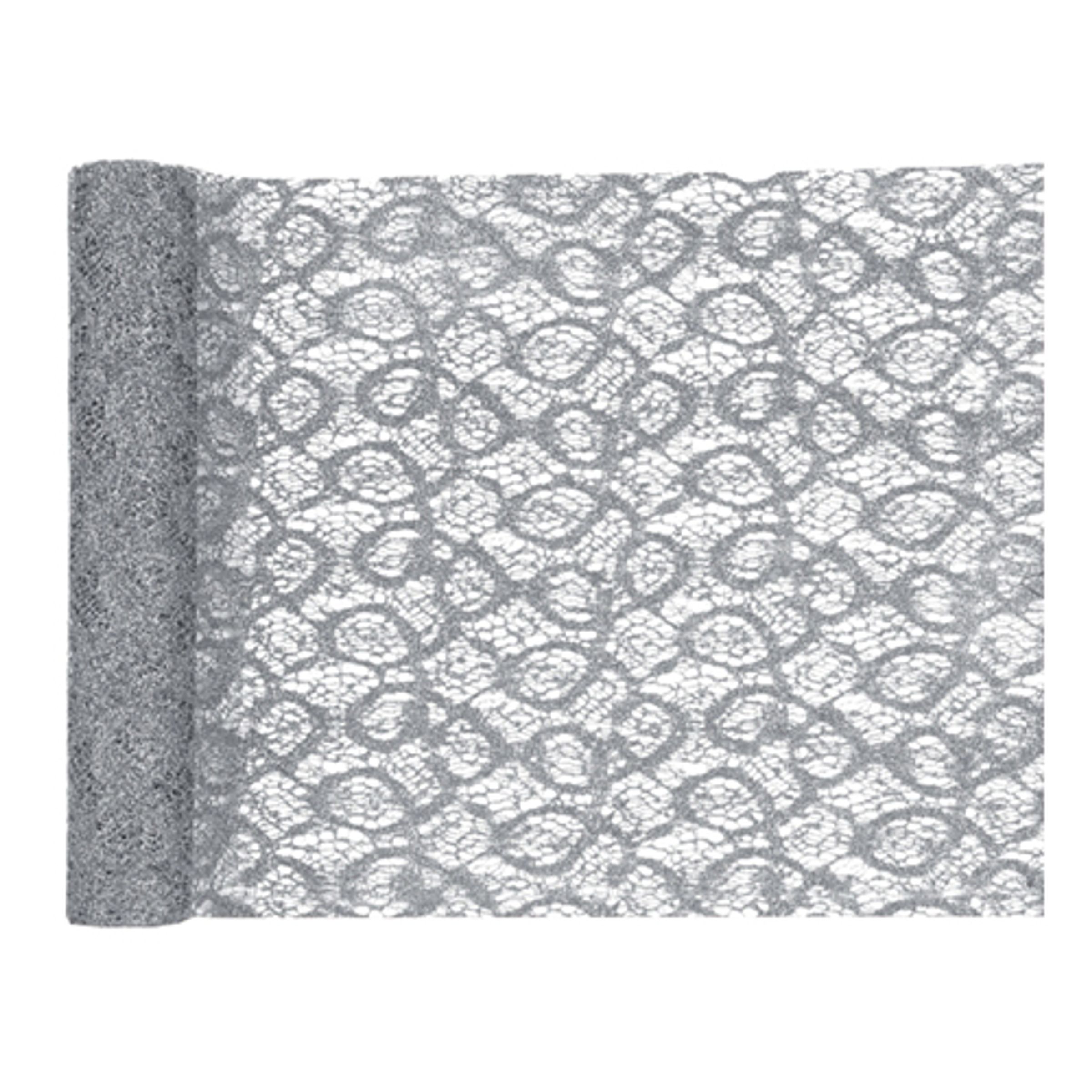 Bordslöpare Silvermetallic är en silverfärgad duk med ett spetsliknande mönster. Duken är tillverkad i polyester och den är 28 x 500 cm stor.