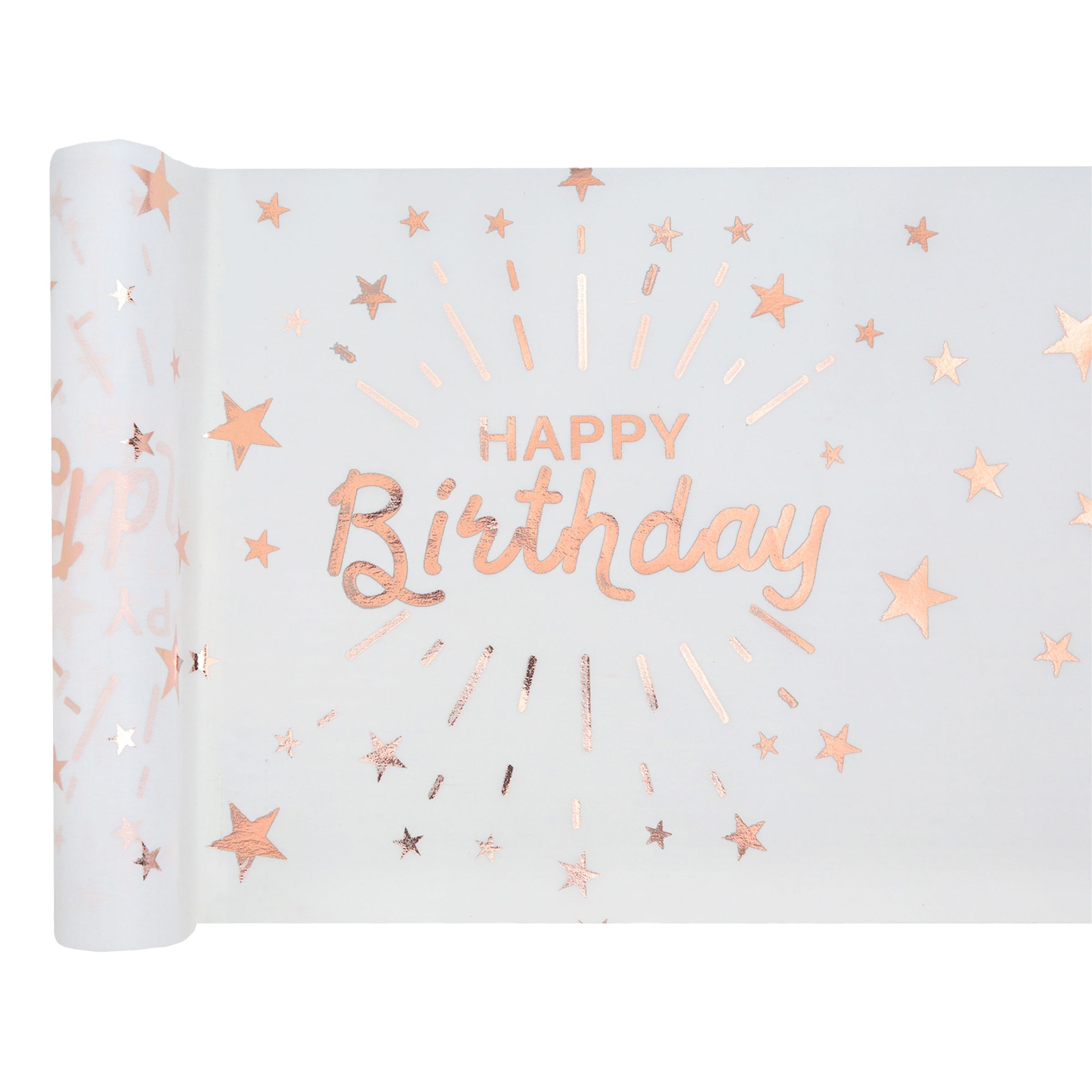 Bordslöpare Sparkling Happy Birthday Vit/Roséguld är en snygg bordslöpare som du enkelt rullar ut över bordet. Bordslöparen är vit med detaljer i roséguld där det står "Happy Birthday". Passar perfekt till födelsedagsfesten!