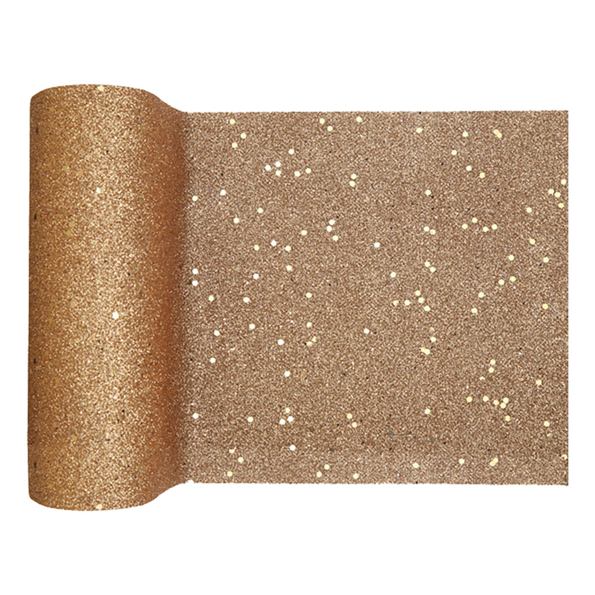 Bordslöpare tjock roséguld är en långsmal bordsduk som mäter 500 x 18 centimeter och som passar perfekt att placera i mitten av bordet. Duken är tillverkad av polyester och prydd av glitter.