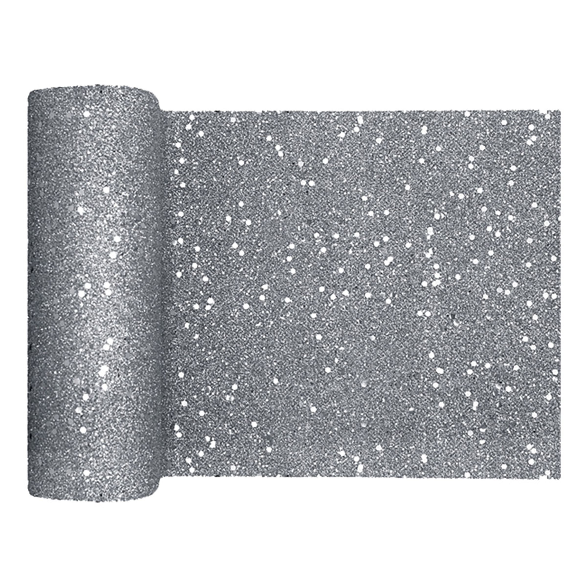 Bordslöpare Tjock Silver Glitter är en glittrig bordslöpare i silver. Den är tillverkad av polyester och har en tjock design. Mäter ca 500 x 18 cm. Säljs styckvis.