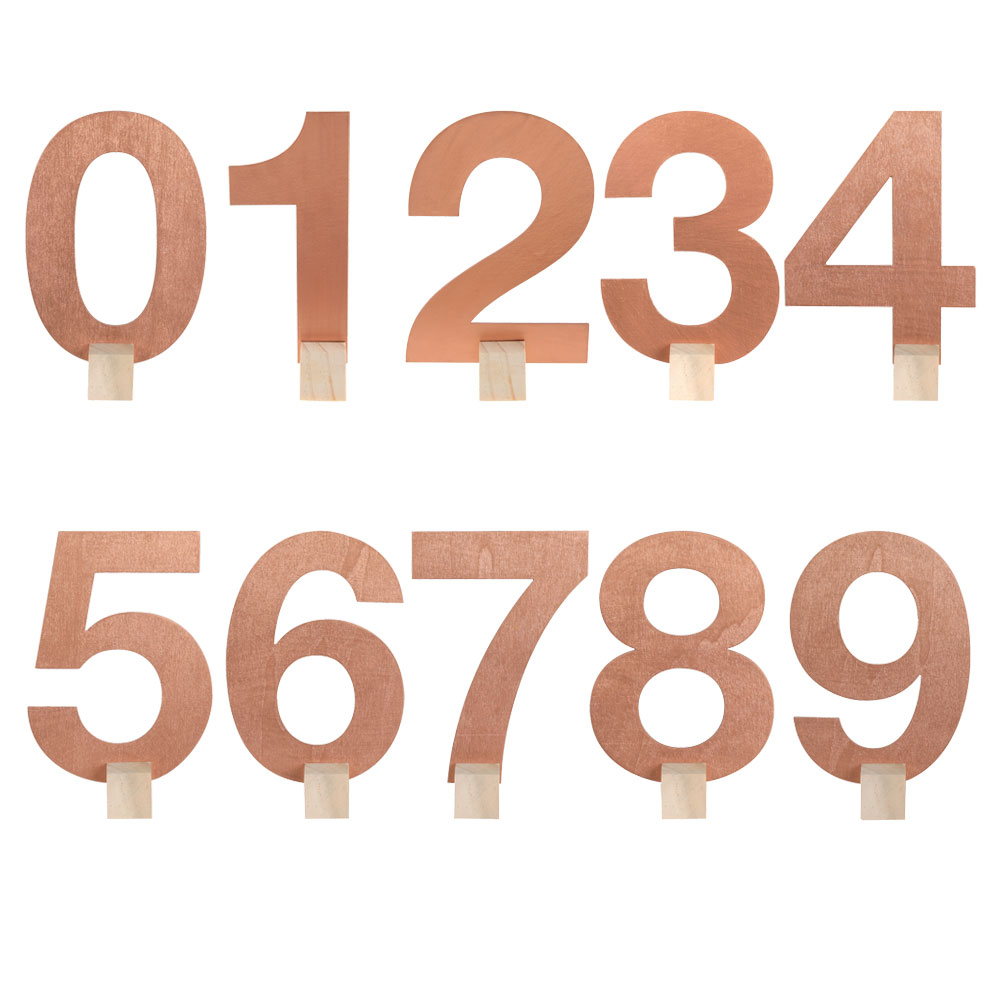 Använd dig av bordsplacering och bordsnumrering till nästa fest och märk ut de olika borden med hjälp av dessa snygga bordsnummer i form av roseguldiga siffror. Dekorativa bordsnummer av trä som gör det enkelt för gästerna att hitta till rätt bord samtidigt som de blir en snygg detalj. Passande bordsnummer till alla festligheter med många gäster så som bröllop eller dop.
