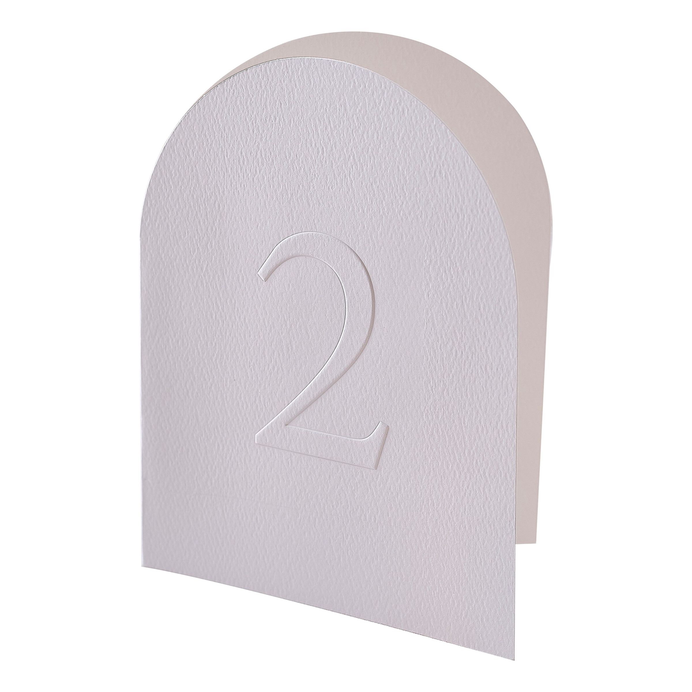 Bordsnumrering Kort Vita inkluderar 12 stycken kort med textur i siffrorna 1-12. Med sin stilrena look kommer den bli riktigt snygg på det eleganta bröllopet. Bordsnumren är vikta på mitten, vilket gör att de kan stå fristående på borden.