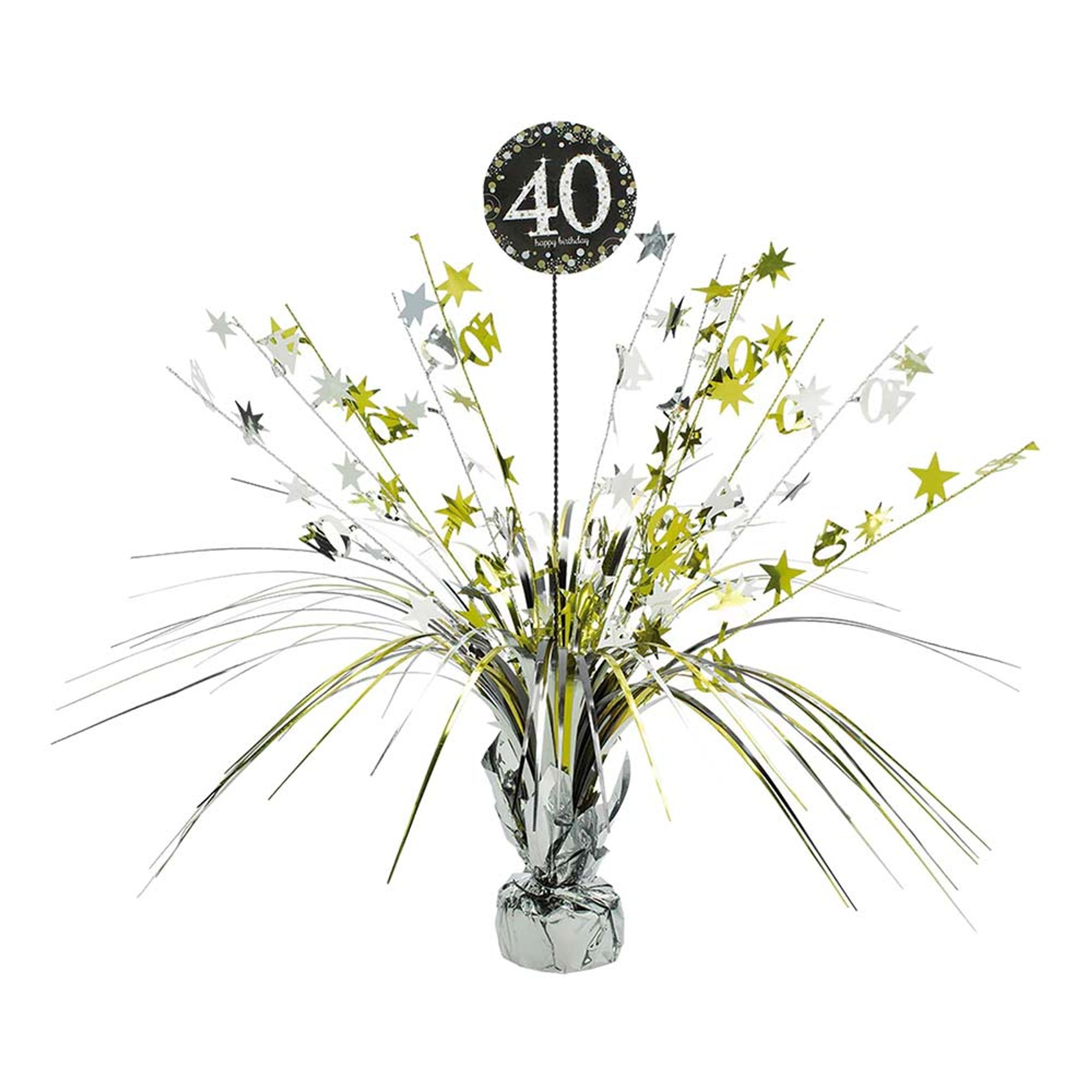 Bordspjäs 40 Guld/Silver Glitter innehåller en bordspjäs perfekt att ställa mitt på kalasbordet. Pjäsen ser ut som ett fyrverkeri av skimrande strån med siffran 40. Perfekt när det vankas födelsedagsfest!