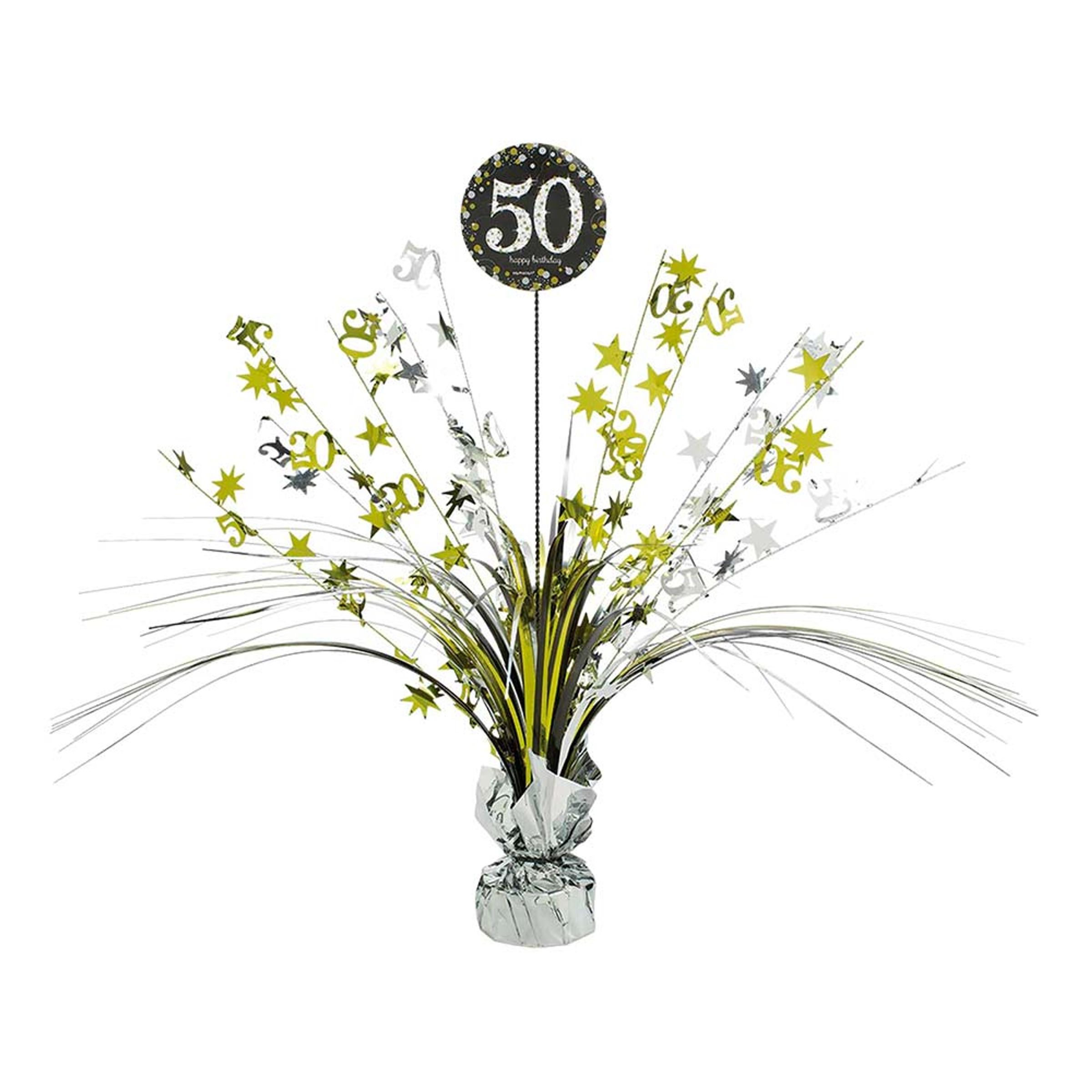 Bordspjäs 50 Guld/Silver Glitter innehåller en bordspjäs perfekt att ställa mitt på kalasbordet. Pjäsen ser ut som ett fyrverkeri av skimrande strån med siffran 50. Perfekt när det vankas födelsedagsfest!