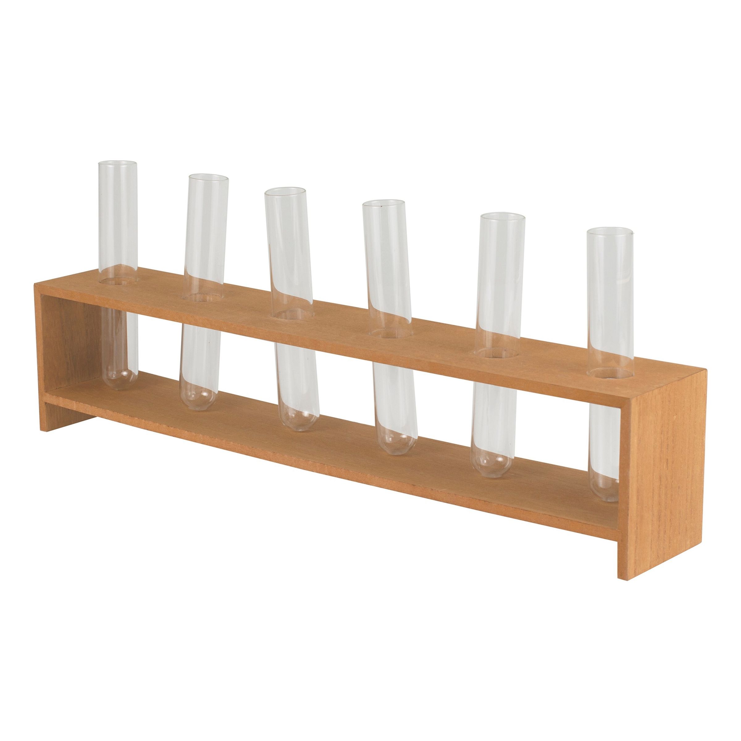 Bordspjäs i Trä med Glasbehållare innehåller en bordsdekoration gjord av en rustik trähållare med sex stycken glasrörshållare. Passar lika bra till bröllopet som att dekorera hemmet med.